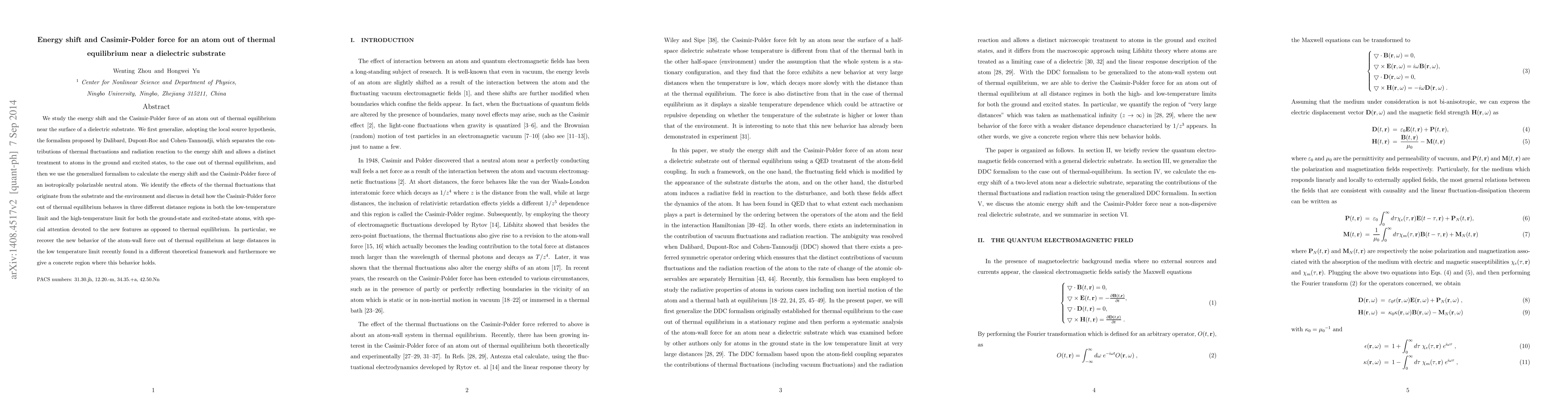 This paper generalizes the Dalibard-Dupont-Roc-Cohen-Tannoudji formalism to study the energy shift and Casimir-Polder force for an atom out of thermal equilibrium near a dielectric substrate, highlighting effects from thermal fluctuations and the behavior in different distance regions and temperature limits. It identifies unique characteristics of the atom-wall interaction outside thermal equilibrium.