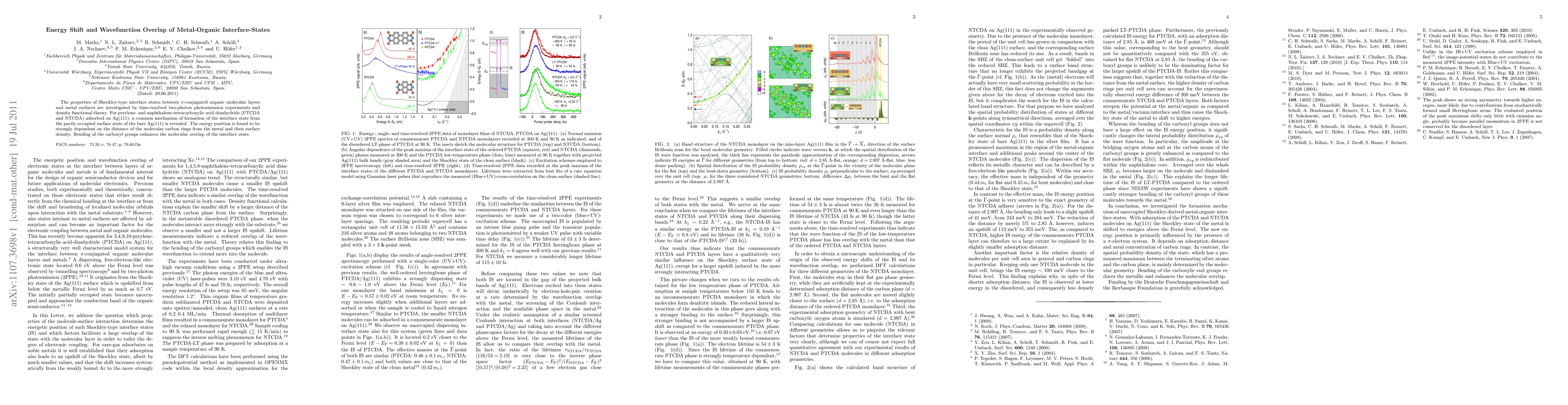 This study investigates the formation and energy shift of Shockley-type interface states at metal-organic interfaces using time-resolved two-photon photoemission and DFT. It reveals that the energy position of these states is influenced by the molecular carbon ring distance from the metal and surface density, with carboxyl group bending enhancing wavefunction overlap.