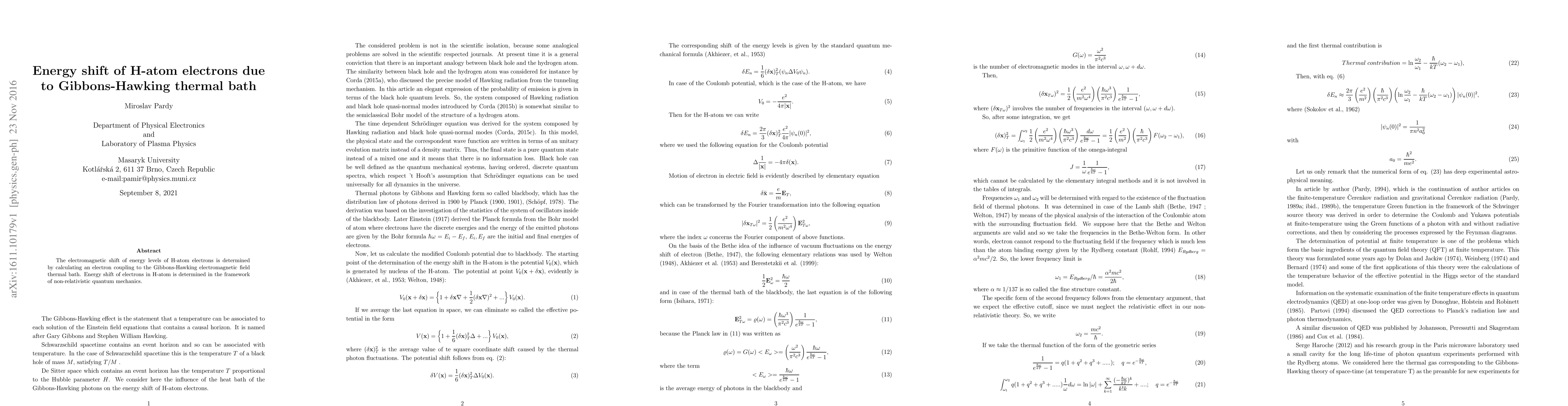 The electromagnetic shift of energy levels of H-atom electrons is determined by calculating an electron coupling to the Gibbons-Hawking electromagnetic field thermal bath. Energy shift of electrons in H-atom is determined in the framework of the non-relativistic quantum mechanics.