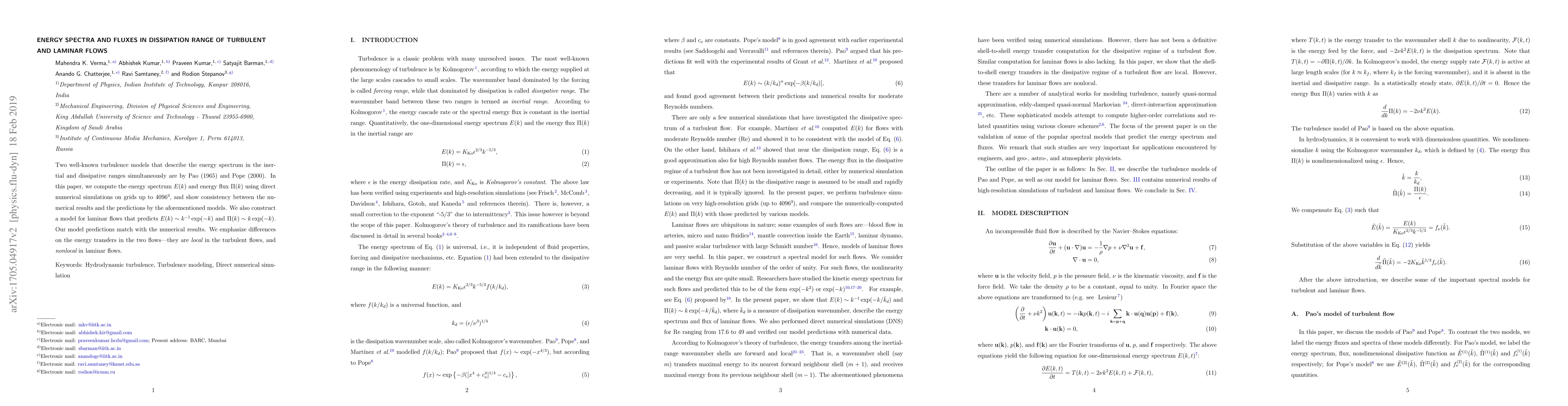 Two well-known turbulence models that describe the energy spectrum in the inertial and dissipative ranges simultaneously are by Pao~(1965) and Pope~(2000). In this paper, we compute the energy spectrum $E(k)$ and energy flux $\Pi(k)$ using direct numerical simulations on grids up to $4096^3$, and show consistency between the numerical results and the predictions by the aforementioned models. We also construct a model for laminar flows that predicts $E(k)\sim k^{-1} \exp(-k)$ and $\Pi(k)\sim k \exp(-k)$. Our model predictions match with the numerical results. We emphasize differences on the energy transfers in the two flows---they are {\em local} in the turbulent flows, and {\em nonlocal} in laminar flows.