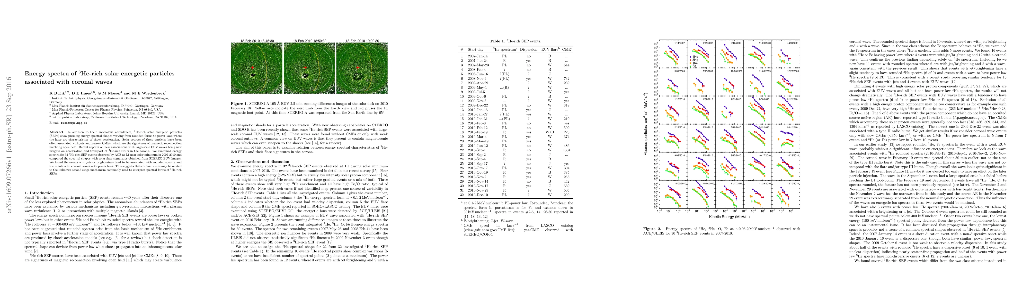 In addition to their anomalous abundances, 3He-rich solar energetic particles (SEPs) show puzzling energy spectral shapes varying from rounded forms to power laws where the later are characteristics of shock acceleration. Solar sources of these particles have been often associated with jets and narrow CMEs, which are the signatures of magnetic reconnection involving open field. Recent reports on new associations with large-scale EUV waves bring new insights on acceleration and transport of 3He-rich SEPs in the corona. We examined energy spectra for 32 3He-rich SEP events observed by ACE at L1 near solar minimum in 2007-2010 and compared the spectral shapes with solar flare signatures obtained from STEREO EUV images. We found the events with jets or brightenings tend to be associated with rounded spectra and the events with coronal waves with power laws. This suggests that coronal waves may be related to the unknown second stage mechanism commonly used to interpret spectral forms of 3He-rich SEPs.