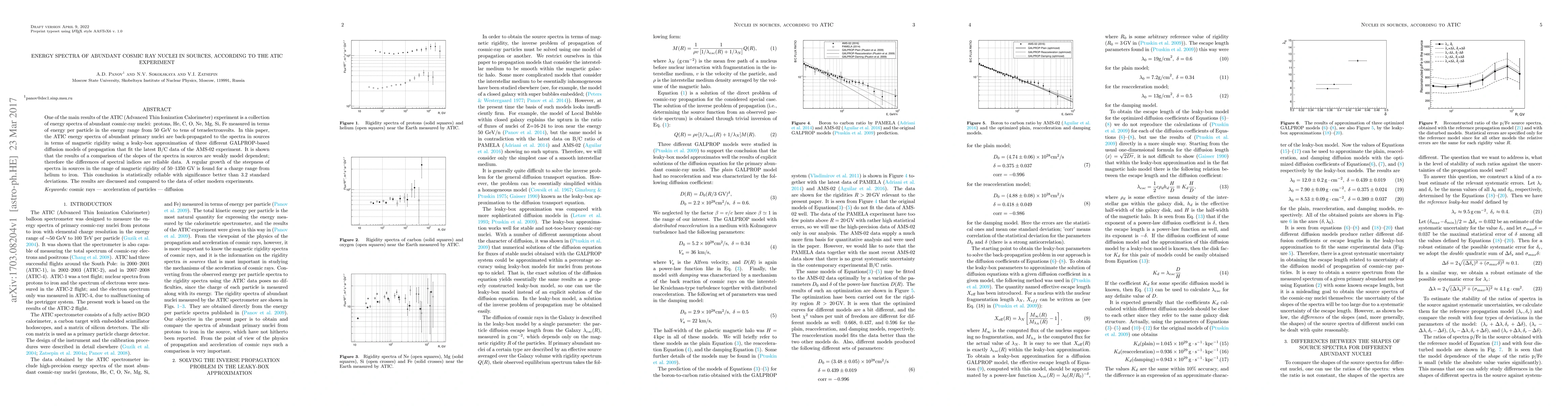 The ATIC experiment provides energy spectra for abundant cosmic-ray nuclei, which are back-propagated to source spectra using different GALPROP-based diffusion models. The study finds a regular increase in the steepness of these spectra across a range of magnetic rigidities, indicating a reliable trend from helium to iron.