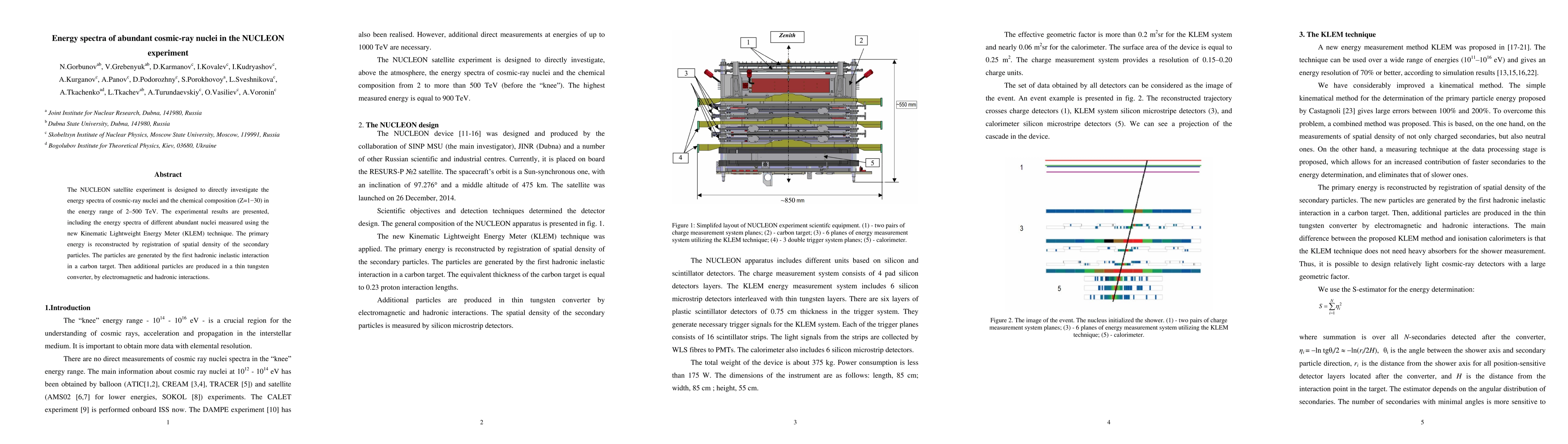 The NUCLEON satellite experiment measures the energy spectra of abundant cosmic-ray nuclei in the 2-500 TeV range using the KLEM technique, reconstructing primary energy through secondary particle density and interactions in carbon and tungsten targets. The results provide detailed insights into cosmic-ray composition.