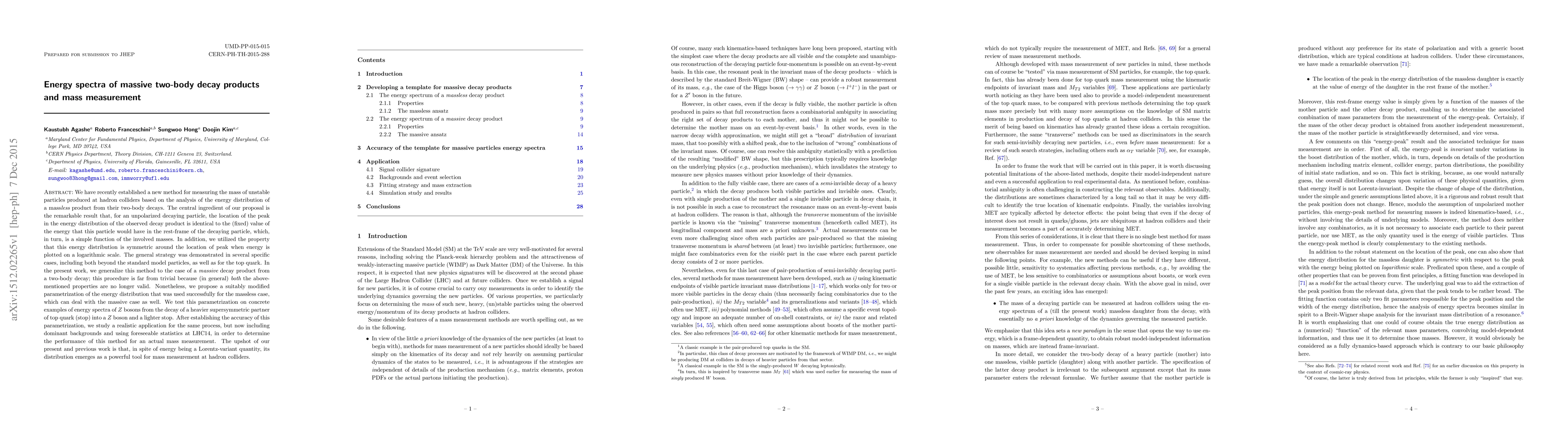 We have recently established a new method for measuring the mass of unstable particles produced at hadron colliders based on the analysis of the energy distribution of a massless product from their two-body decays. The central ingredient of our proposal is the remarkable result that, for an unpolarized decaying particle, the location of the peak in the energy distribution of the observed decay product is identical to the (fixed) value of the energy that this particle would have in the rest-frame of the decaying particle, which, in turn, is a simple function of the involved masses. In addition, we utilized the property that this energy distribution is symmetric around the location of peak when energy is plotted on a logarithmic scale. The general strategy was demonstrated in several specific cases, including both beyond the SM particles, as well as for the top quark. In the present work, we generalize this method to the case of a massive decay product from a two-body decay; this procedure is far from trivial because (in general) both the above- mentioned properties are no longer valid. Nonetheless, we propose a suitably modified parametrization of the energy distribution that was used successfully for the massless case, which can deal with the massive case as well. We establish the accuracy of this parametrization using concrete examples of energy spectra of Z bosons from the decay of a heavier stop into a Z boson and a lighter stop. We then study a realistic application for the same process, but now including dominant backgrounds and using foreseeable statistics at LHC14, in order to determine the performance of this method for an actual mass measurement. The upshot of our present and previous work is that, in spite of energy being a Lorentz-variant quantity, its distribution emerges as a powerful tool for mass measurement at hadron colliders.