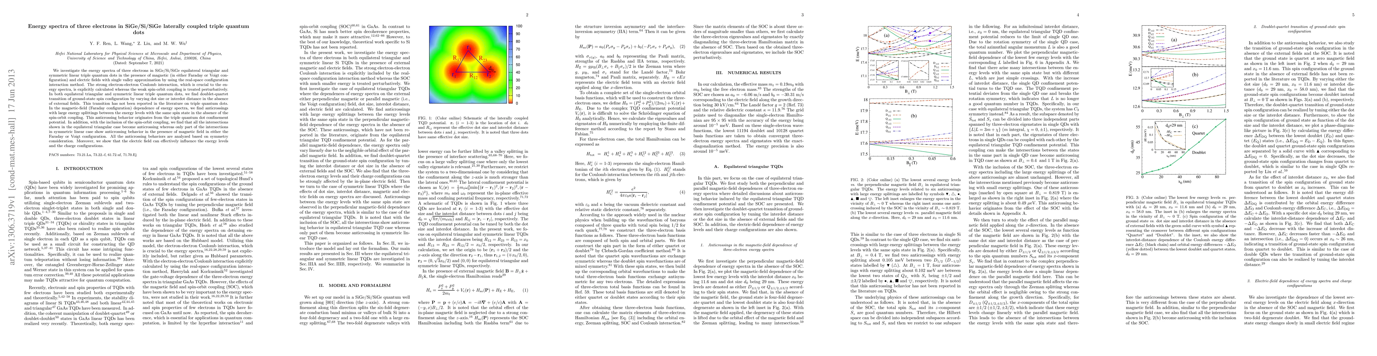 This study investigates the energy spectra of three electrons in SiGe/Si/SiGe triple quantum dots under magnetic and electric fields, using the real-space configuration interaction method. It reveals a doublet-quartet transition in ground-state spin configurations and significant anticrossing behavior in energy levels due to confinement potential, with varying effects based on dot geometry and spin-orbit coupling.