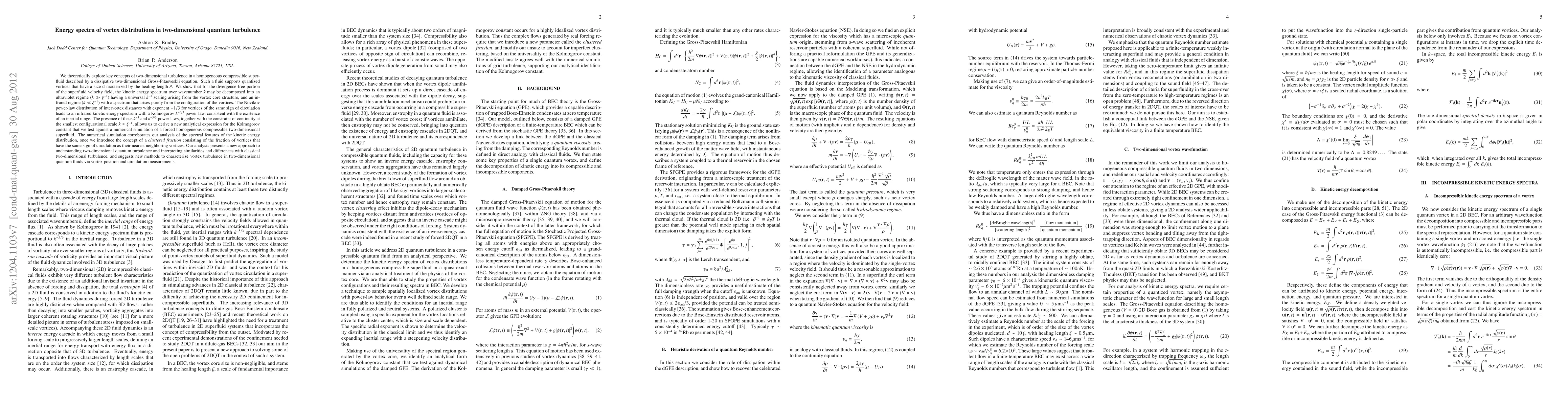 We theoretically explore key concepts of two-dimensional turbulence in a homogeneous compressible superfluid described by a dissipative two-dimensional Gross-Pitaeveskii equation. Such a fluid supports quantized vortices that have a size characterized by the healing length $\xi$. We show that for the divergence-free portion of the superfluid velocity field, the kinetic energy spectrum over wavenumber $k$ may be decomposed into an ultraviolet regime ($k\gg \xi^{-1}$) having a universal $k^{-3}$ scaling arising from the vortex core structure, and an infrared regime ($k\ll\xi^{-1}$) with a spectrum that arises purely from the configuration of the vortices. The Novikov power-law distribution of intervortex distances with exponent -1/3 for vortices of the same sign of circulation leads to an infrared kinetic energy spectrum with a Kolmogorov $k^{-5/3}$ power law, consistent with the existence of an inertial range. The presence of these $k^{-3}$ and $k^{-5/3}$ power laws, together with the constraint of continuity at the smallest configurational scale $k\approx\xi^{-1}$, allows us to derive a new analytical expression for the Kolmogorov constant that we test against a numerical simulation of a forced homogeneous compressible two-dimensional superfluid. The numerical simulation corroborates our analysis of the spectral features of the kinetic energy distribution, once we introduce the concept of a {\em clustered fraction} consisting of the fraction of vortices that have the same sign of circulation as their nearest neighboring vortices. Our analysis presents a new approach to understanding two-dimensional quantum turbulence and interpreting similarities and differences with classical two-dimensional turbulence, and suggests new methods to characterize vortex turbulence in two-dimensional quantum fluids via vortex position and circulation measurements.