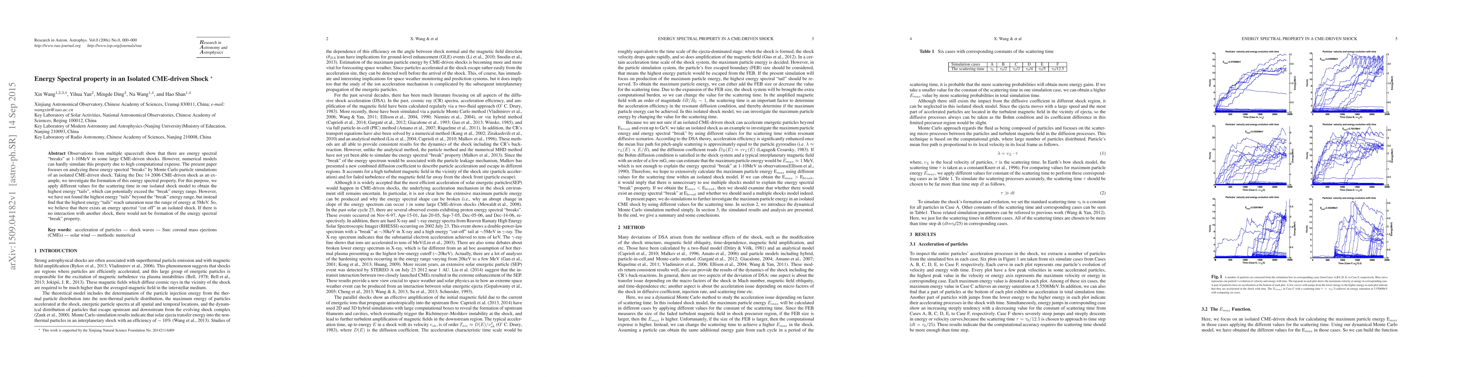 Observations from multiple spacecraft show that there are energy spectral "breaks" at 1-10MeV in some large CME-driven shocks. However, numerical models can hardly simulate this property due to high computational expense. The present paper focuses on analyzing these energy spectral "breaks" by Monte Carlo particle simulations of an isolated CME-driven shock. Taking the Dec 14 2006 CME-driven shock as an example, we investigate the formation of this energy spectral property. For this purpose, we apply different values for the scattering time in our isolated shock model to obtain the highest energy "tails", which can potentially exceed the "break" energy range. However, we have not found the highest energy "tails" beyond the "break" energy range, but instead find that the highest energy "tails" reach saturation near the range of energy at 5MeV. So, we believe that there exists an energy spectral "cut off" in an isolated shock. If there is no interaction with another shock, there would not be formation of the energy spectral "break" property.