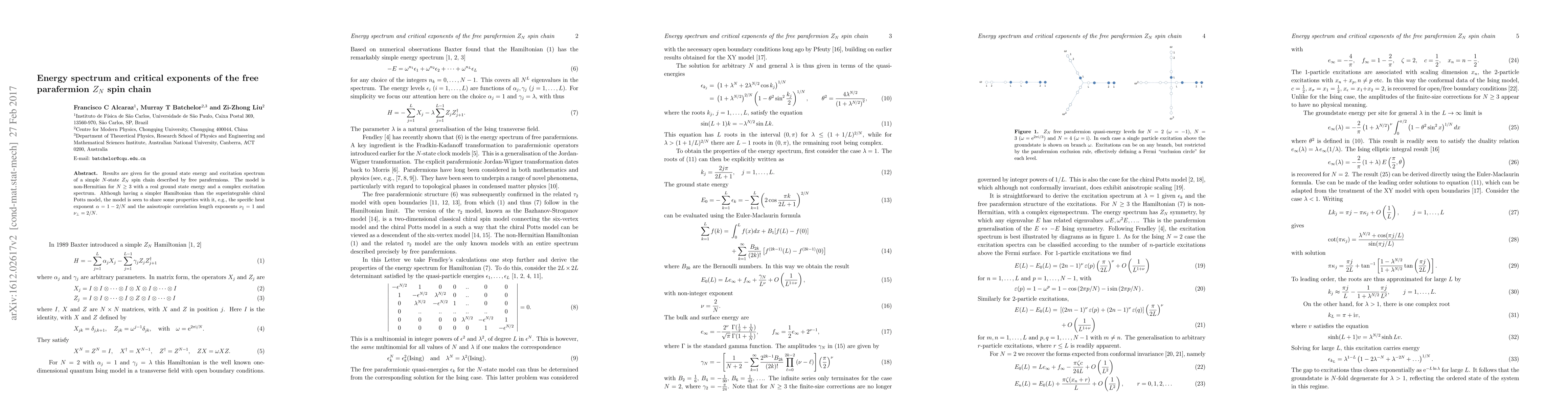 This paper investigates the energy spectrum and critical exponents of a free parafermion $Z_N$ spin chain, revealing non-Hermitian characteristics with a real ground state and complex excitations. It shares critical properties with the superintegrable chiral Potts model, including specific heat exponent $\alpha=1-2/N$ and correlation length exponents $\nu_\parallel =1$ and $\nu_\perp=2/N$.