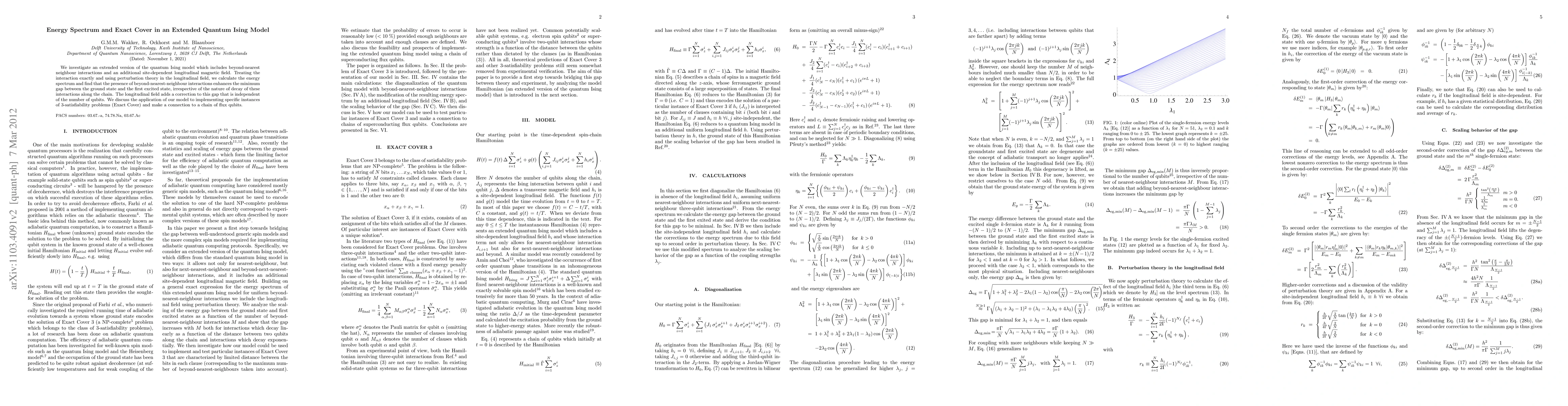 We investigate an extended version of the quantum Ising model which includes beyond-nearest neighbour interactions and an additional site-dependent longitudinal magnetic field. Treating the interaction exactly and using perturbation theory in the longitudinal field, we calculate the energy spectrum and find that the presence of beyond-nearest-neighbour interactions enhances the minimal gap between the ground state and the first excited state, irrespective of the nature of decay of these interactions along the chain. The longitudinal field adds a correction to this gap that is independent of the number of qubits. We discuss the application of our model to implementing specific instances of 3-satisfiability problems (Exact Cover) and make a connection to a chain of flux qubits.