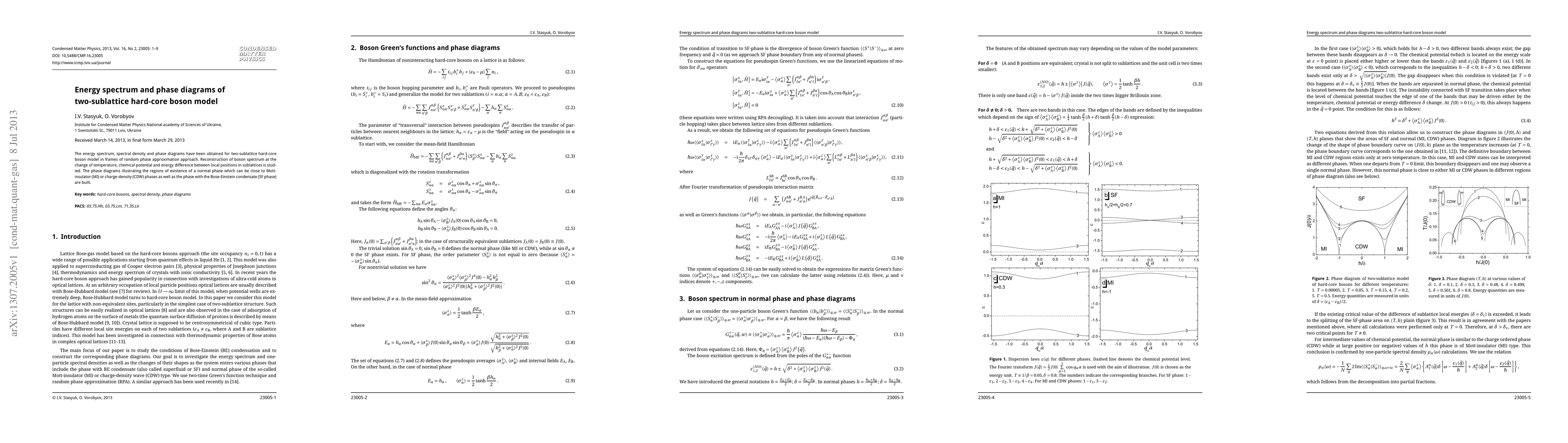 This paper investigates the energy spectrum and phase diagrams of a two-sublattice hard-core boson model using the random phase approximation approach. It examines the reconstruction of the boson spectrum under varying temperature, chemical potential, and energy differences, and constructs phase diagrams showing normal phase regions near Mott-insulator and charge-density phases, as well as a Bose-Einstein condensate phase.