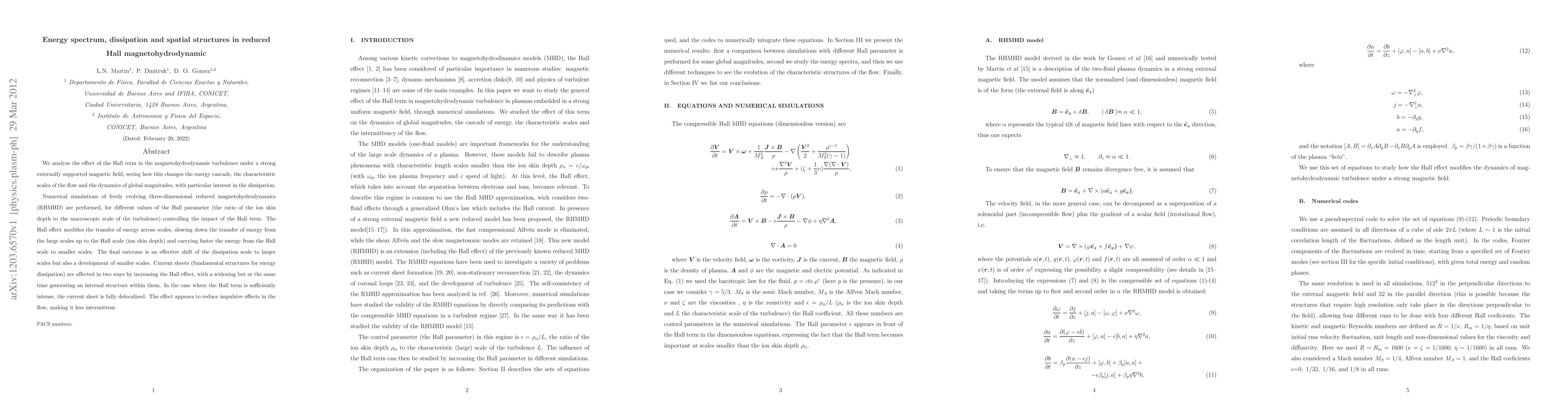 This paper investigates the influence of the Hall term in reduced magnetohydrodynamics under strong magnetic fields, finding that it alters the energy cascade and dissipation scales. Numerical simulations show that the Hall effect shifts dissipation to larger scales while generating smaller, more structured current sheets.