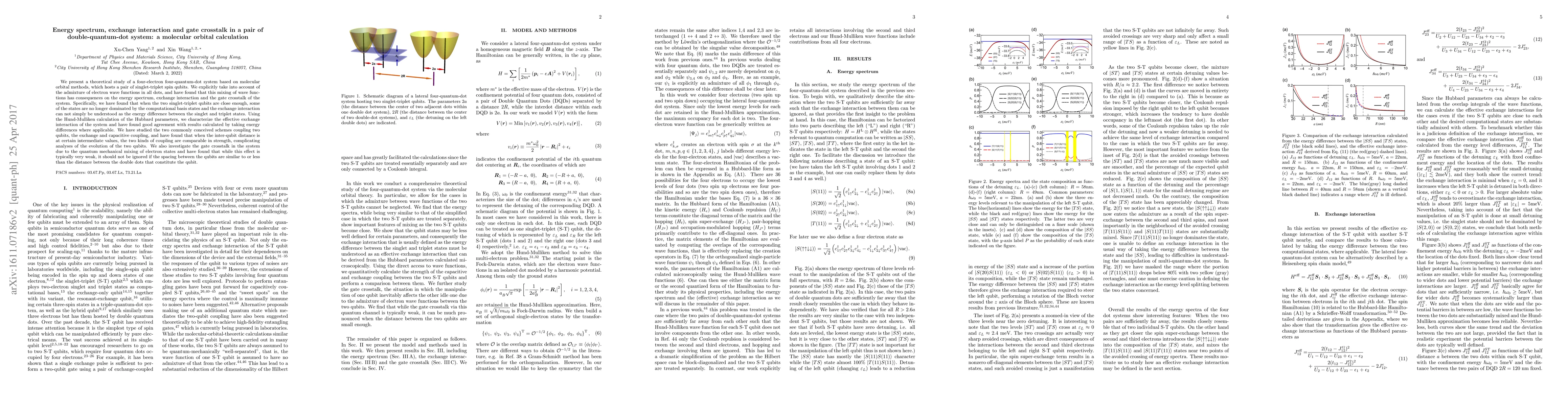 We present a theoretical study of a four-electron four-quantum-dot system based on molecular orbital methods, which hosts a pair of singlet-triplet spin qubits. We explicitly take into account of the admixture of electron wave functions in all dots, and have found that this mixing of wave functions has consequences on the energy spectrum, exchange interaction and the gate crosstalk of the system. Specifically, we have found that when the two singlet-triplet qubits are close enough, some of the states are no longer dominated by the computational basis states and the exchange interaction can not simply be understood as the energy difference between the singlet and triplet states. Using the Hund-Mulliken calculation of the Hubbard parameters, we characterize the effective exchange interaction of the system and have found good agreement with results calculated by taking energy differences where applicable. We have studied the two commonly conceived schemes coupling two qubits, the exchange and capacitive coupling, and have found that when the inter-qubit distance is at certain intermediate values, the two kinds of coupling are comparable in strength, complicating analyses of the evolution of the two qubits. We also investigate the gate crosstalk in the system due to the quantum mechanical mixing of electron states and have found that while this effect is typically very weak, it should not be ignored if the spacing between the qubits are similar to or less than the distance between the double dots that constitute the qubit.