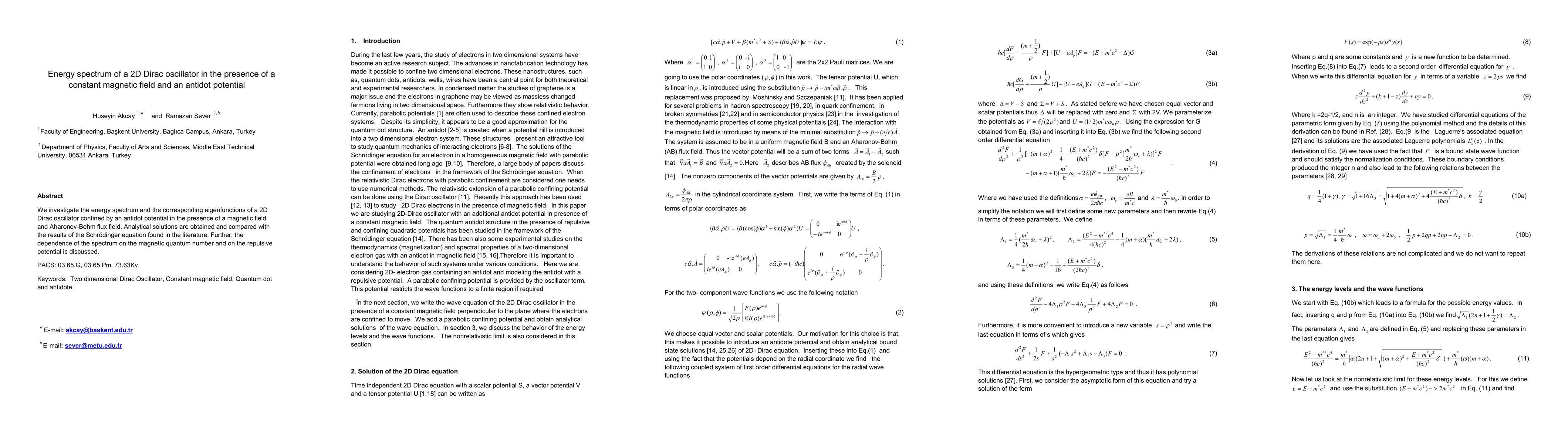 This paper analytically investigates the energy spectrum and eigenfunctions of a 2D Dirac oscillator subjected to a constant magnetic field and an antidot potential, comparing results with existing Schrödinger equation findings and discussing the spectrum's dependence on magnetic quantum number and potential strength.
