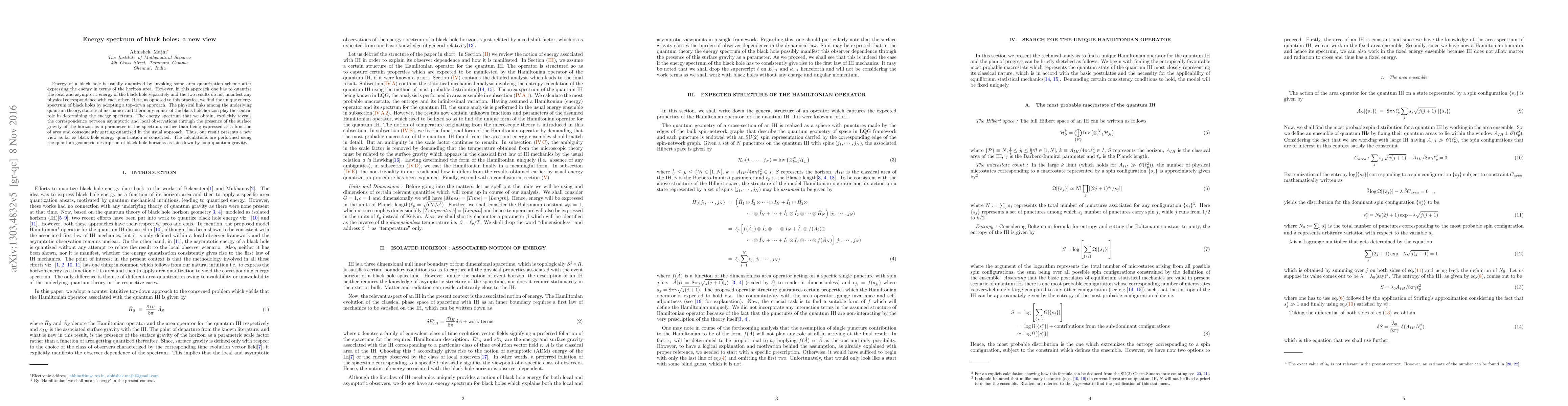 Energy of a black hole is usually quantized by invoking some area quantization scheme after expressing the energy in terms of the horizon area. However, in this approach one has to quantize the local and asymptotic energy of the black hole separately and the two results do not manifest any physical correspondence with each other. Here, as opposed to this practice, we find the unique energy spectrum of black holes by adopting a top-down approach. The physical links among the underlying quantum theory, statistical mechanics and thermodynamics of the black hole horizon play the central role in determining the energy spectrum. The energy spectrum that we obtain, explicitly reveals the correspondence between asymptotic and local observations through the presence of the surface gravity of the horizon as a parameter in the spectrum, rather than being expressed as a function of area and consequently getting quantized in the usual approach. Thus, our result presents a new view as far as black hole energy quantization is concerned. The calculations are performed using the quantum geometric description of black hole horizons as laid down by loop quantum gravity.