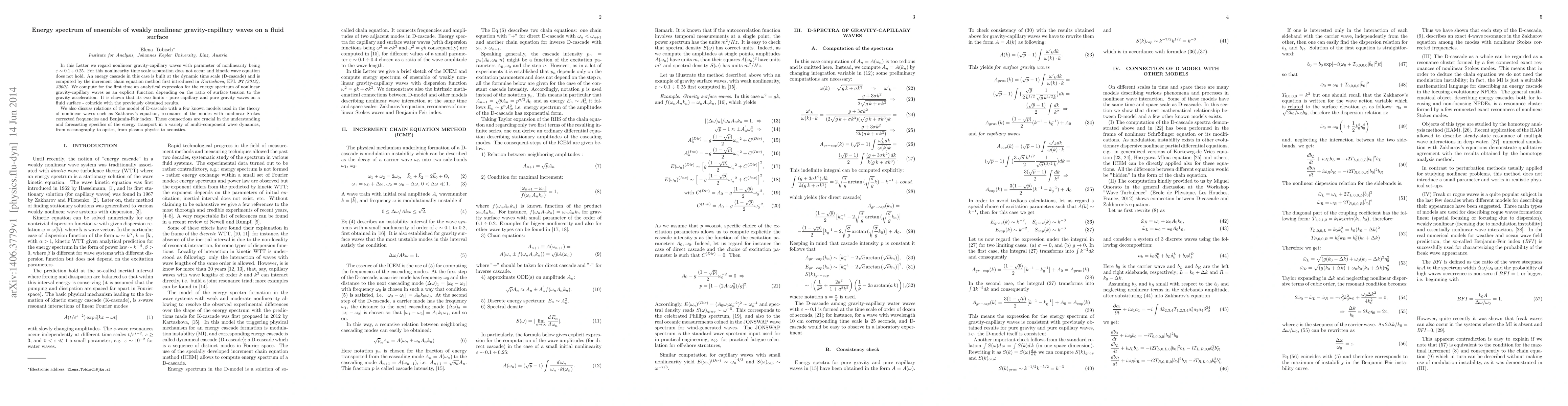 This paper presents an analytical expression for the energy spectrum of weakly nonlinear gravity-capillary waves, computed using the increment chain equation method. It reveals the dynamics of energy cascades in the absence of time scale separation and discusses its connections to various models in nonlinear wave theory.