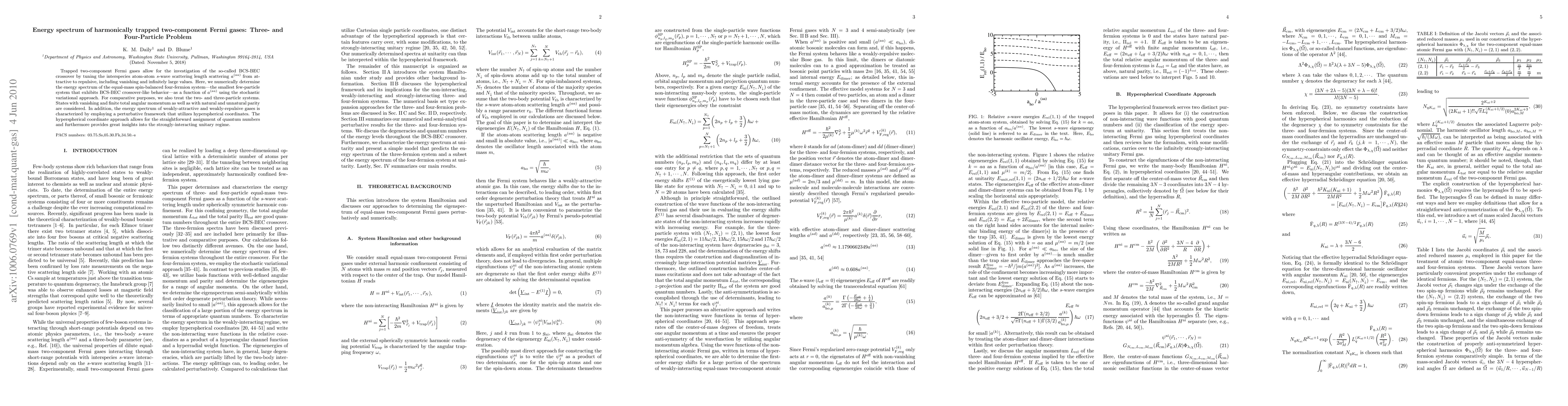 This paper numerically investigates the energy spectrum of harmonically trapped two-component Fermi gases, focusing on the BCS-BEC crossover. It employs the stochastic variational approach to determine the spectrum for four-fermion systems, comparing results with two- and three-particle systems, and uses hyperspherical coordinates to analyze weakly-interacting regimes.