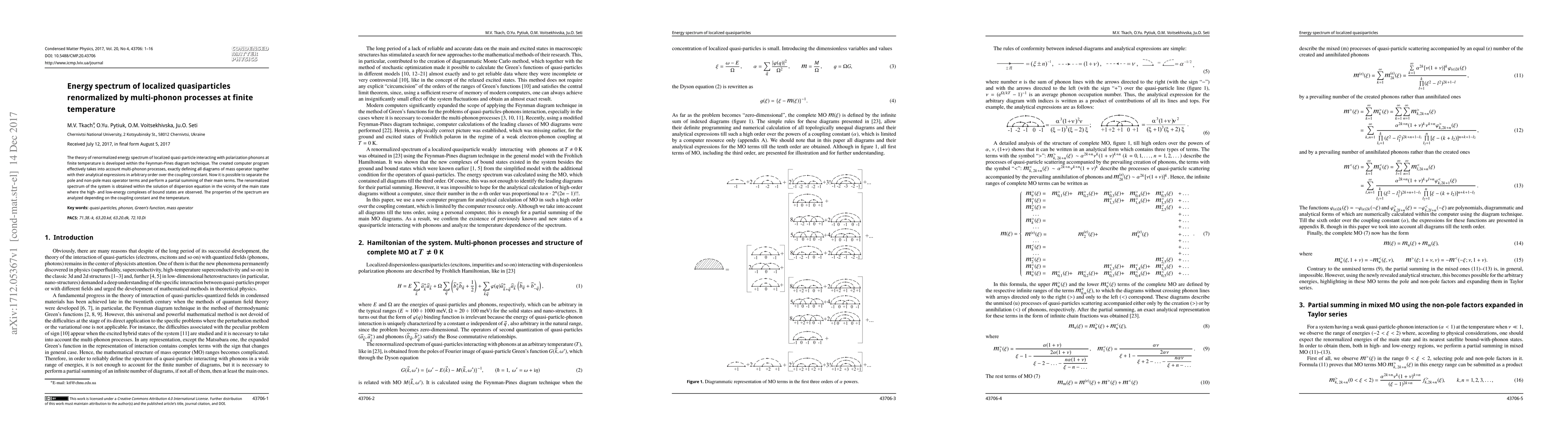 The theory of renormalized energy spectrum of localized quasi-particle interacting with polarization phonons at finite temperature is developed within the Feynman-Pines diagram technique. The created computer program effectively takes into account multi-phonon processes, exactly defining all diagrams of mass operator together with their analytical expressions in arbitrary order over the coupling constant. Now it is possible to separate the pole and non-pole mass operator terms and perform a partial summing of their main terms. The renormalized spectrum of the system is obtained within the solution of dispersion equation in the vicinity of the main state where the high- and low-energy complexes of bound states are observed. The properties of the spectrum are analyzed depending on the coupling constant and the temperature.