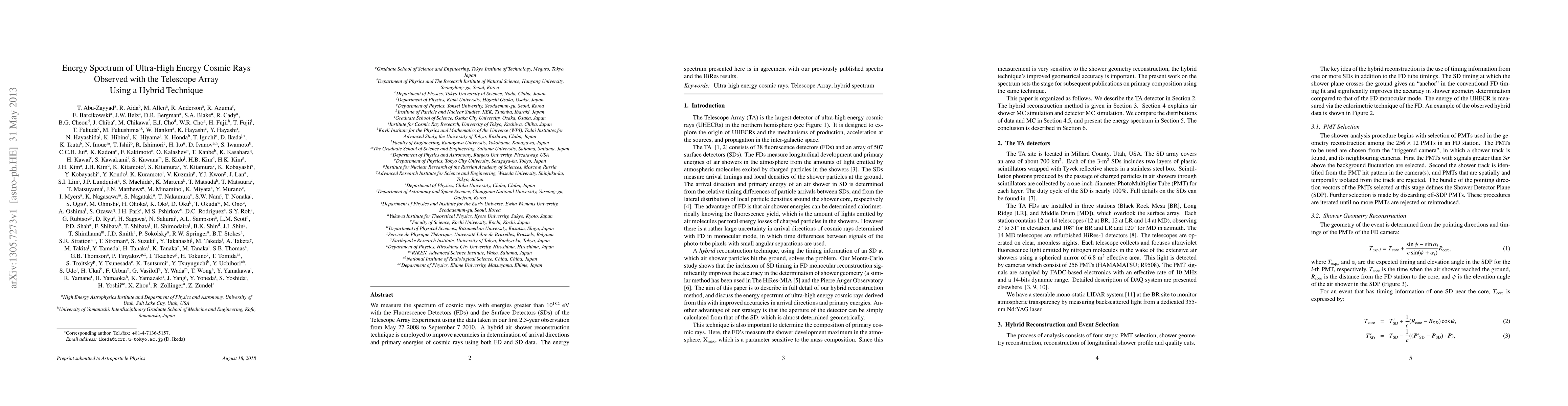 This study measures the energy spectrum of ultra-high energy cosmic rays above $10^{18.2}$ eV using the Telescope Array's hybrid technique combining Fluorescence and Surface Detectors. The results confirm previously published spectra and align with HiRes findings.