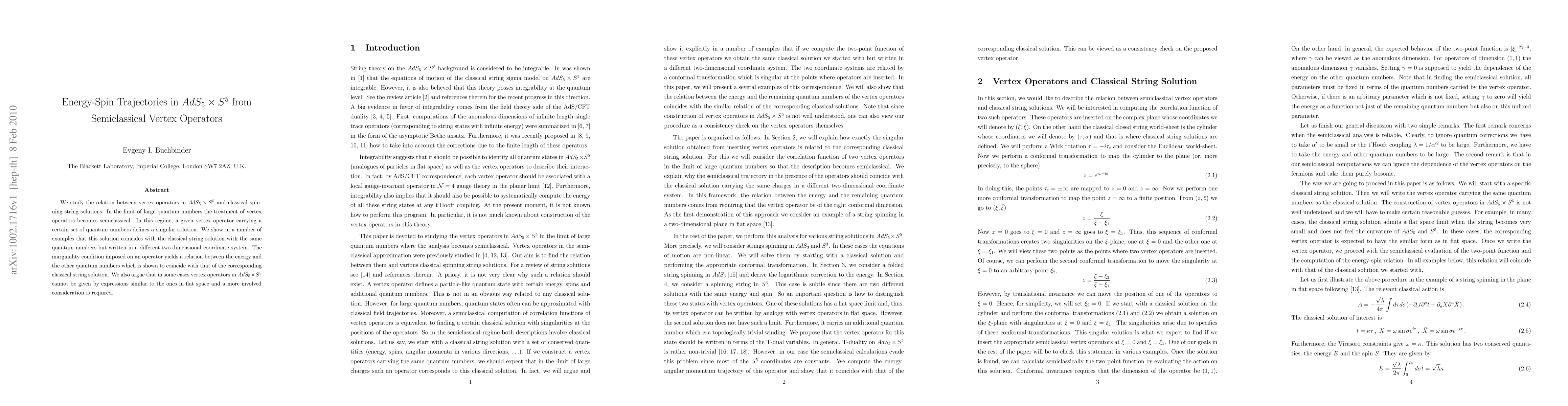 Summary: This paper investigates the correspondence between semiclassical vertex operators in AdS_5 x S^5 and classical spinning string solutions, demonstrating that they match in specific quantum number configurations and highlighting the importance of marginality conditions in relating energy to other quantum numbers. It also notes that some operators require more complex treatments than their flat space counterparts.