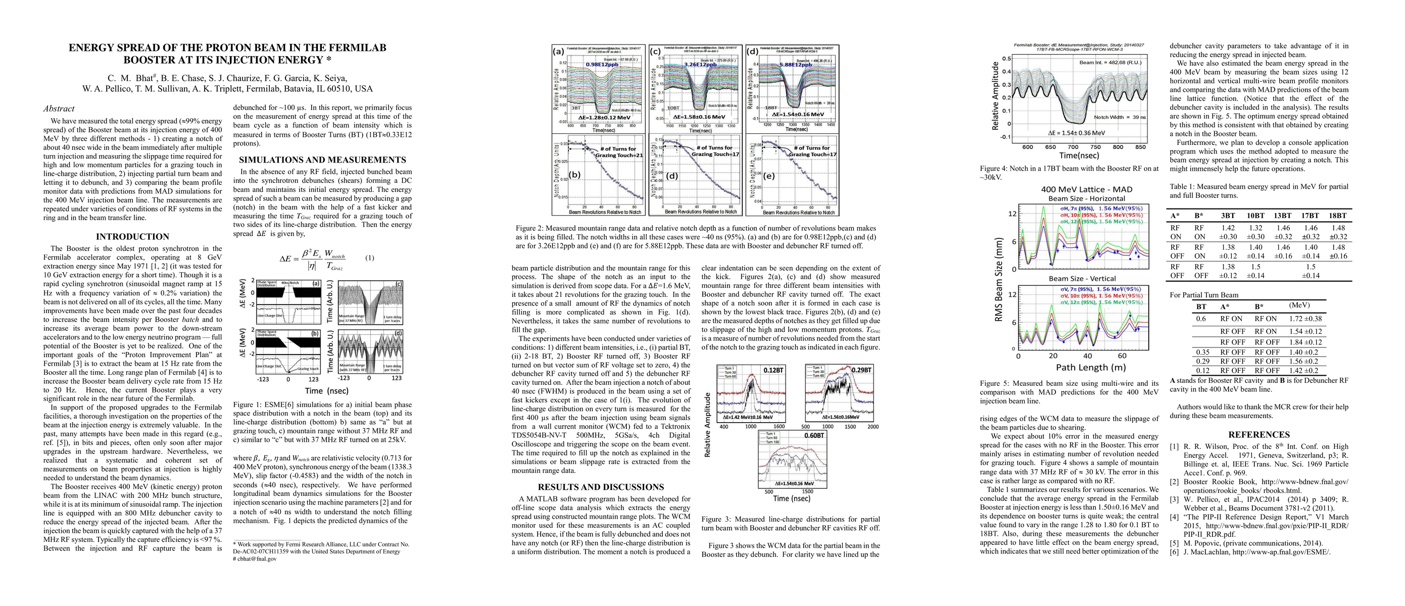 This study measures the total energy spread of the Fermilab Booster proton beam at its 400 MeV injection energy using three methods: slippage time analysis, partial turn injection, and comparison with MAD simulations. Results are obtained under various RF system conditions.