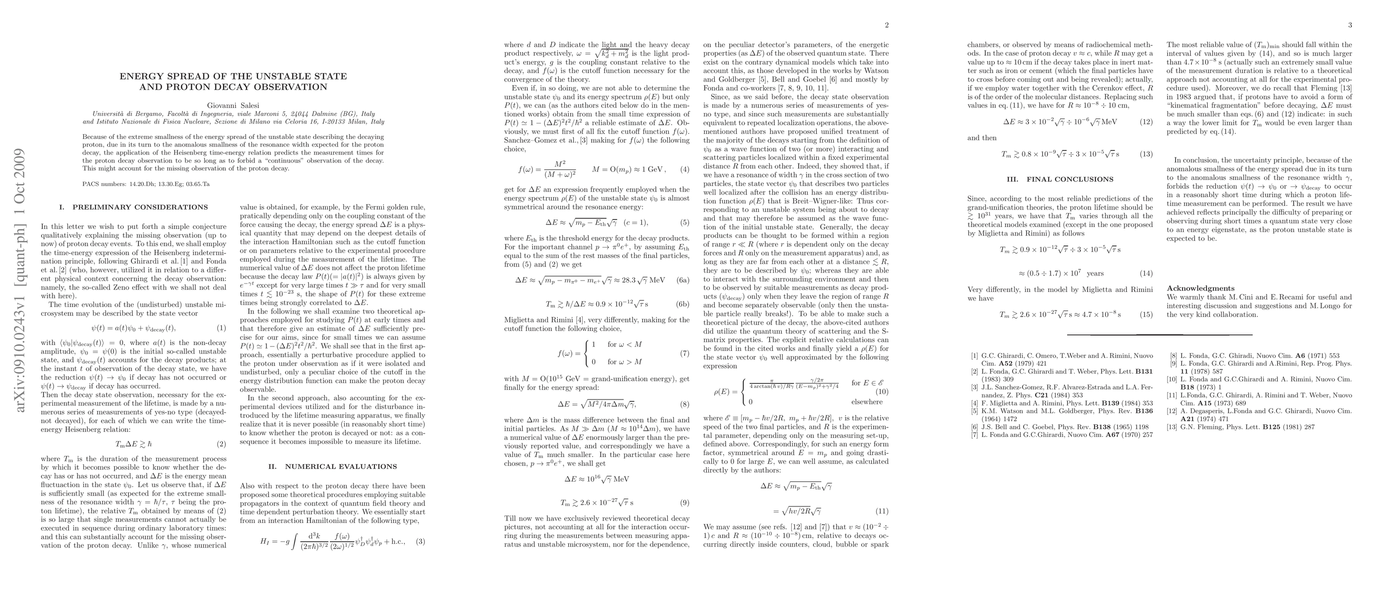Because of the extreme smallness of the energy spread of the unstable state describing the decaying proton, due in its turn to the anomalous smallness of the resonance width expected for the proton decay, the application of the Heisenberg time-energy relation predicts the measurement times for the proton decay observation to be so long as to forbid a "continuous" observation of the decay. This might account for the missing observation of the proton decay.