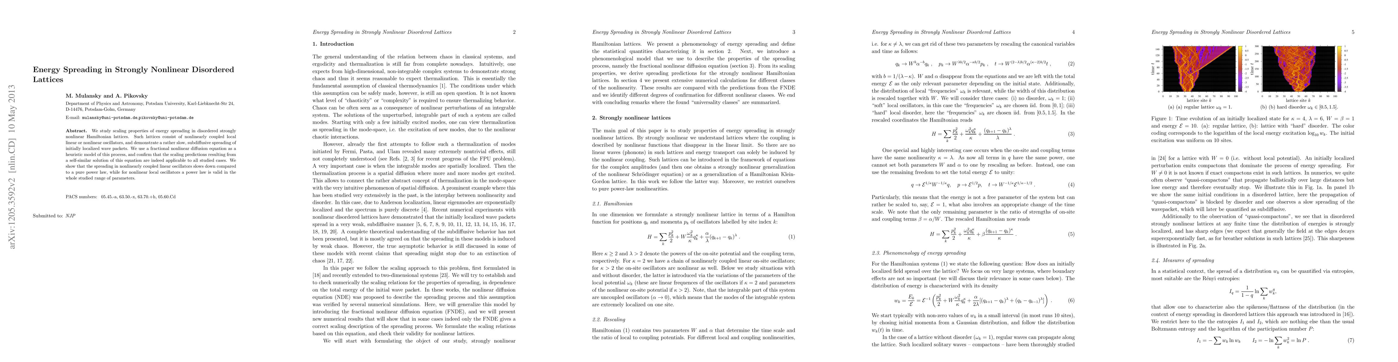 We study scaling properties of energy spreading in disordered strongly nonlinear Hamiltonian lattices. Such lattices consist of nonlinearly coupled local linear or nonlinear oscillators, and demonstrate a rather slow, subdiffusive spreading of initially localized wave p ackets. We use a fractional nonlinear diffusion equation as a heuristic model of this process, and confirm that the scaling predictions resulting from a self-similar solution of this equation are indeed applicable to all studied cases. We s how that the spreading in nonlinearly coupled linear oscillators slows down compared to a pure power law, while for nonlinear local oscillators a power law is valid in the whole studied range of parameters.