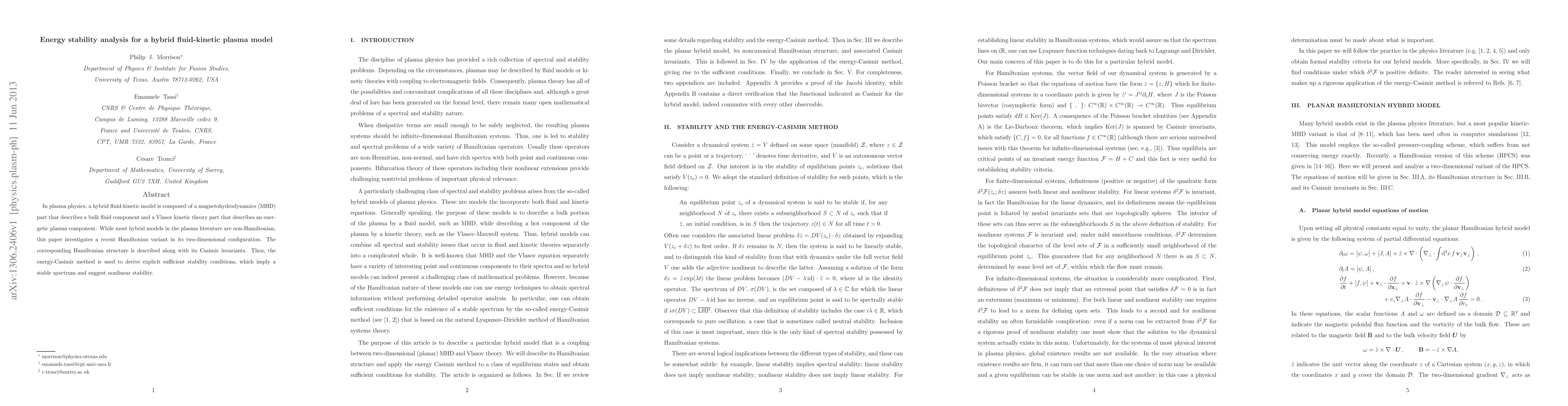 This paper examines a Hamiltonian variant of a hybrid fluid-kinetic plasma model, focusing on the two-dimensional configuration. It derives explicit stability conditions using the energy-Casimir method, indicating stable spectra and suggesting nonlinear stability.