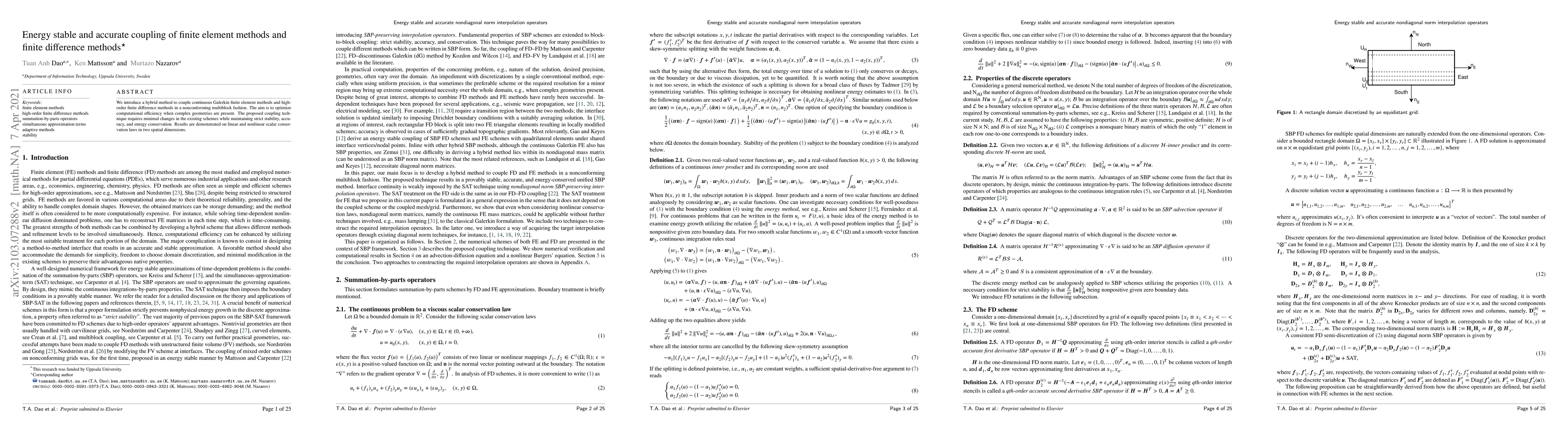 We introduce a hybrid method to couple continuous Galerkin finite element methods and high-order finite difference methods in a nonconforming multiblock fashion. The aim is to optimize computational efficiency when complex geometries are present. The proposed coupling technique requires minimal changes in the existing schemes while maintaining strict stability, accuracy, and energy conservation. Results are demonstrated on linear and nonlinear scalar conservation laws in two spatial dimensions.