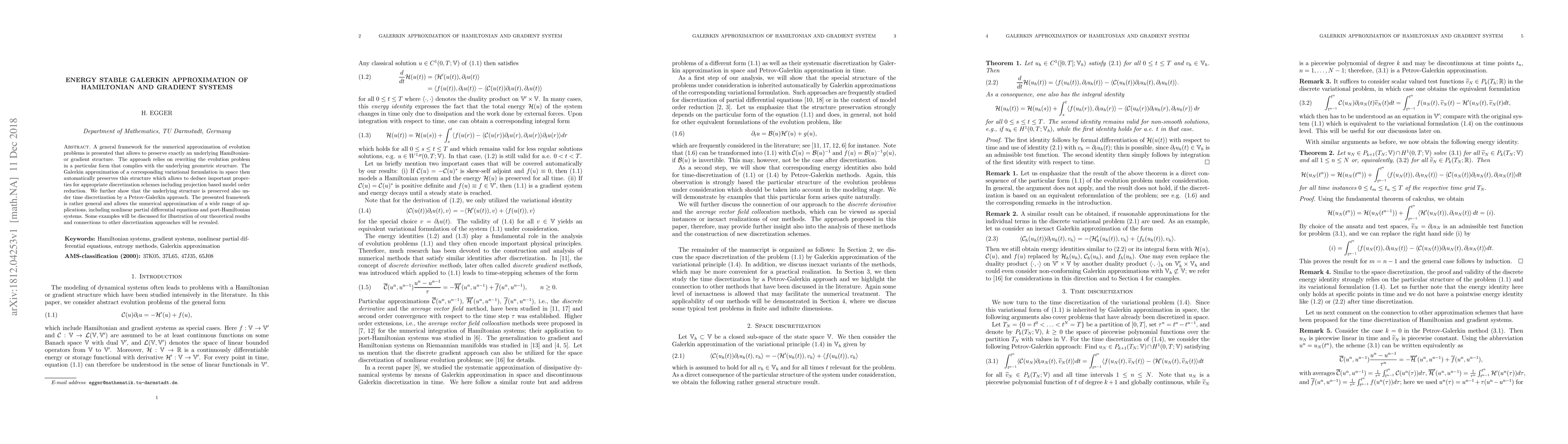 This paper presents a numerical framework for approximating Hamiltonian and gradient systems that exactly preserves their underlying geometric structure. The method uses Galerkin approximation of a variational formulation to maintain this structure, which is further preserved under time discretization via a Petrov-Galerkin approach, applicable to a broad range of nonlinear partial differential equations and port-Hamiltonian systems.