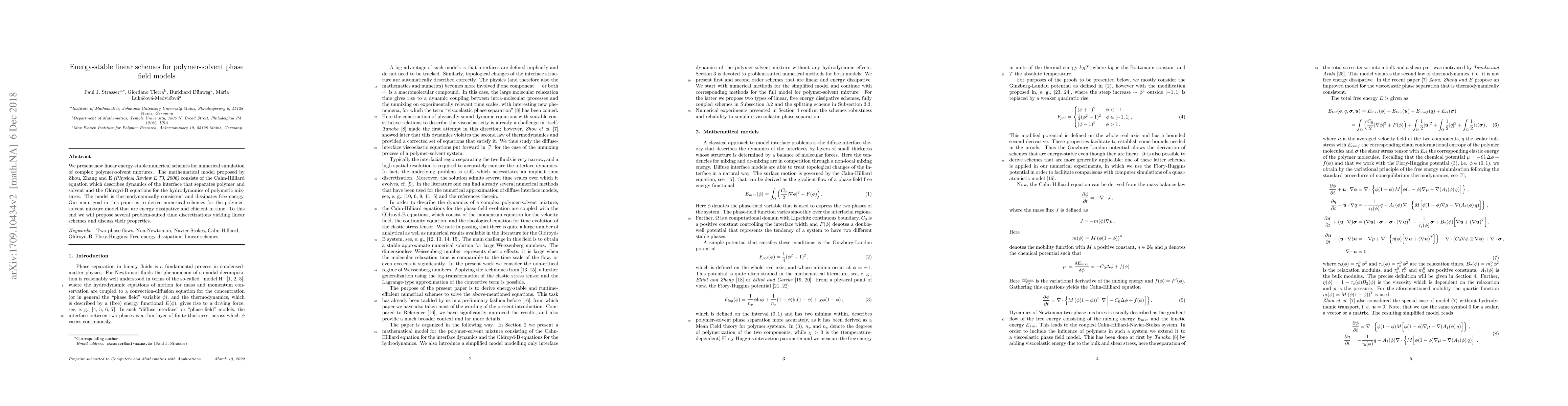 This paper introduces new linear energy-stable numerical schemes for simulating polymer-solvent mixtures using the Cahn-Hilliard and Oldroyd-B equations. The proposed schemes are designed to be both thermodynamically consistent and efficient in time.
