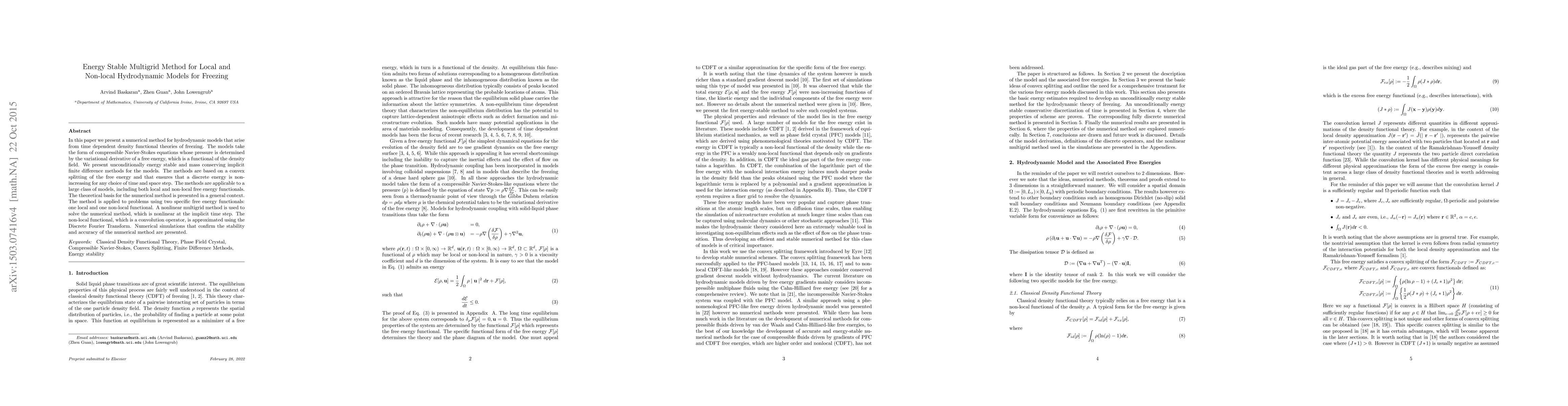 In this paper we present a numerical method for hydrodynamic models that arise from time dependent density functional theories of freezing. The models take the form of compressible Navier-Stokes equations whose pressure is determined by the variational derivative of a free energy, which is a functional of the density field. We present unconditionally energy stable and mass conserving implicit finite difference methods for the models. The methods are based on a convex splitting of the free energy and that ensures that a discrete energy is non-increasing for any choice of time and space step. The methods are applicable to a large class of models, including both local and non-local free energy functionals. The theoretical basis for the numerical method is presented in a general context. The method is applied to problems using two specific free energy functionals: one local and one non-local functional. A nonlinear multigrid method is used to solve the numerical method, which is nonlinear at the implicit time step. The non-local functional, which is a convolution operator, is approximated using the Discrete Fourier Transform. Numerical simulations that confirm the stability and accuracy of the numerical method are presented.