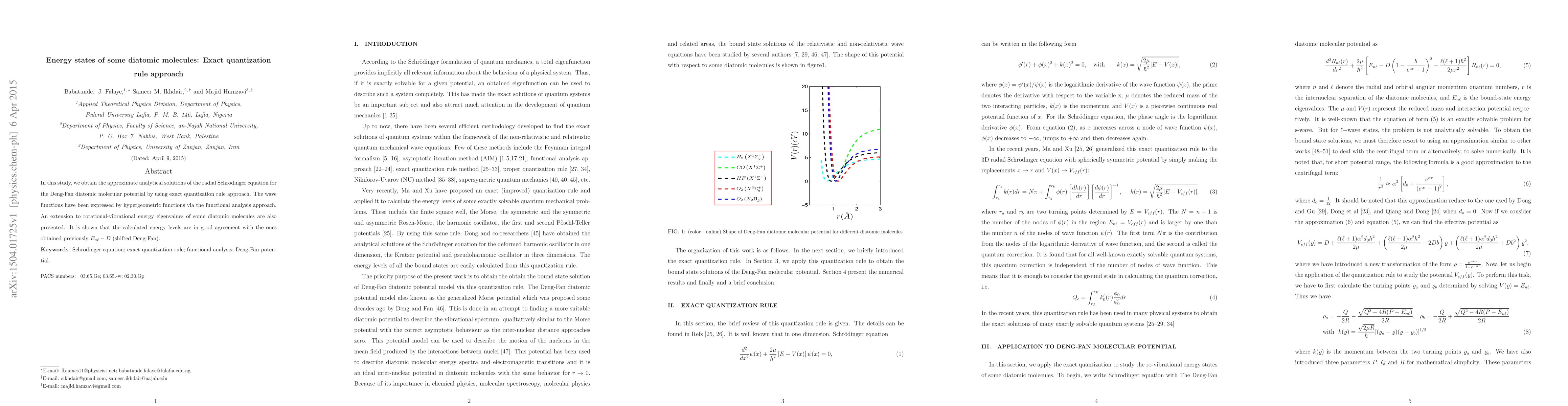 In this study, we obtain the approximate analytical solutions of the radial Schr\"{o}dinger equation for the Deng-Fan diatomic molecular potential by using exact quantization rule approach. The wave functions have been expressed by hypergeometric functions via the functional analysis approach. An extension to rotational-vibrational energy eigenvalues of some diatomic molecules are also presented. It is shown that the calculated energy levels are in good agreement with the ones obtained previously $E_{n\ell}-D$ (shifted Deng-Fan).