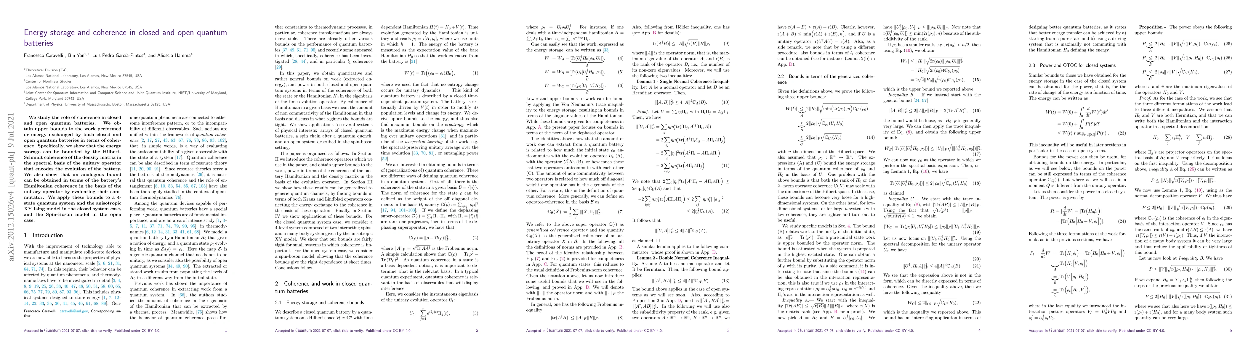 We study the role of coherence in closed and open quantum batteries. We obtain upper bounds to the work performed or energy exchanged by both closed and open quantum batteries in terms of coherence. Specifically, we show that the energy storage can be bounded by the Hilbert-Schmidt coherence of the density matrix in the spectral basis of the unitary operator that encodes the evolution of the battery. We also show that an analogous bound can be obtained in terms of the battery's Hamiltonian coherence in the basis of the unitary operator by evaluating their commutator. We apply these bounds to a 4-state quantum system and the anisotropic XY Ising model in the closed system case, and the Spin-Boson model in the open case.