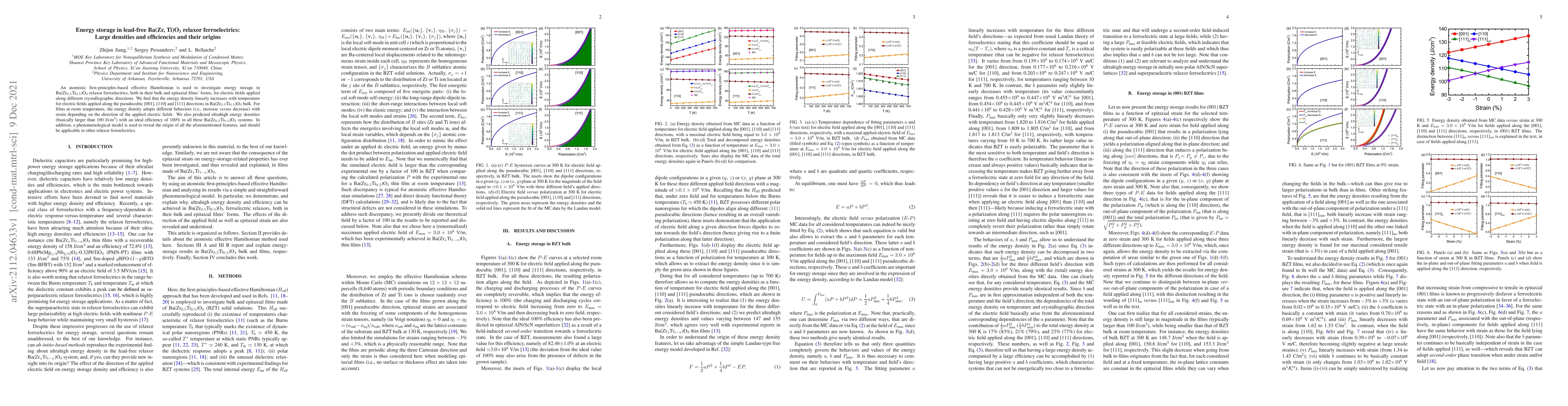 This paper investigates energy storage in lead-free Ba(Zr$_{0.5}$Ti$_{0.5}$)O$_{3}$ relaxor ferroelectrics using an atomistic first-principles approach, revealing ultrahigh energy densities and efficiencies exceeding 100% in both bulk and epitaxial films, with varying temperature-dependent behaviors based on the direction of applied electric fields. A phenomenological model is proposed to explain these findings.