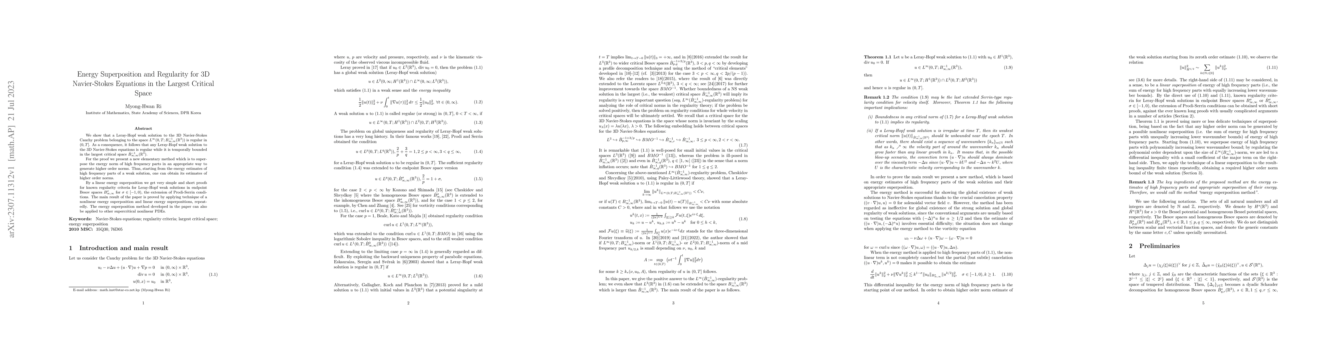 We show that a Leray-Hopf weak solution to the 3D Navier-Stokes Cauchy problem belonging to the space $L^\infty(0,T; B^{-1}_{\infty,\infty}(\mathbb R^3))$ is regular in $(0,T]$. As a consequence, it follows that any Leray-Hopf weak solution to the 3D Navier-Stokes equations is regular while it is temporally bounded in the largest critical space $\dot{B}^{-1}_{\infty,\infty}(\mathbb R^3)$ as well as in any critical spaces. For the proof we present a new elementary method which is to superpose the energy norm of high frequency parts in an appropriate way to generate higher order norms. Thus, starting from the energy estimates of high frequency parts of a weak solution, one can obtain its estimates of higher order norms. By a linear energy superposition we get very simple and short proofs for known regularity criteria for Leray-Hopf weak solutions in endpoint Besov spaces $B^{\sigma}_{\infty,\infty}$ for $\sigma\in [-1,0)$, the extension of Prodi-Serrin conditions. The main result of the paper is proved by applying technique of a nonlinear energy superposition and linear energy superpositions, repeatedly. The energy superposition method developed in the paper can also be applied to other supercritical nonlinear PDEs.