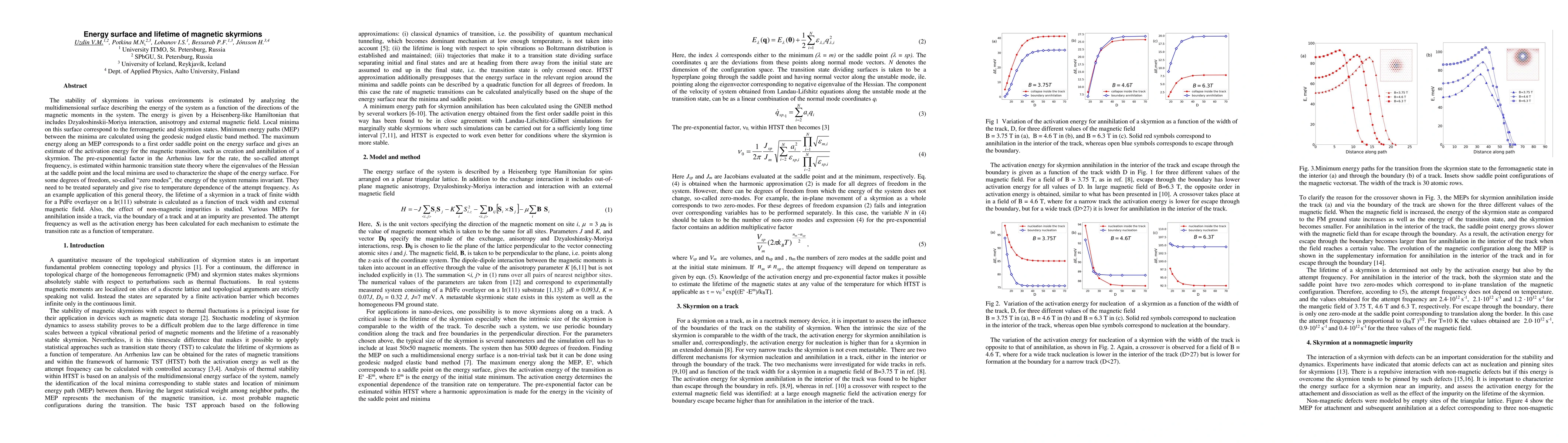 The paper presents a detailed analysis of the energy surface and minimum energy paths for magnetic skyrmion transitions, providing a comprehensive theoretical framework for estimating activation energies and transition rates using geodesic nudged elastic band method and harmonic transition state theory.