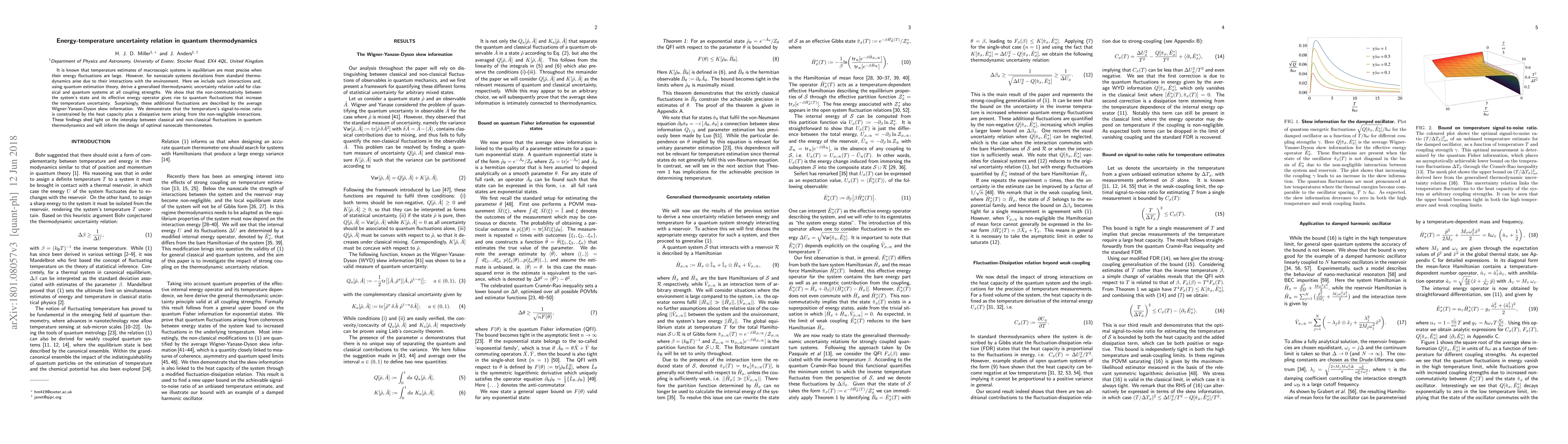 It is known that temperature estimates of macroscopic systems in equilibrium are most precise when their energy fluctuations are large. However, for nanoscale systems deviations from standard thermodynamics arise due to their interactions with the environment. Here we include such interactions and, using quantum estimation theory, derive a generalised thermodynamic uncertainty relation valid for classical and quantum systems at all coupling strengths. We show that the non-commutativity between the system's state and its effective energy operator gives rise to quantum fluctuations that increase the temperature uncertainty. Surprisingly, these additional fluctuations are described by the average Wigner-Yanase-Dyson skew information. We demonstrate that the temperature's signal-to-noise ratio is constrained by the heat capacity plus a dissipative term arising from the non-negligible interactions. These findings shed light on the interplay between classical and non-classical fluctuations in quantum thermodynamics and will inform the design of optimal nanoscale thermometers.