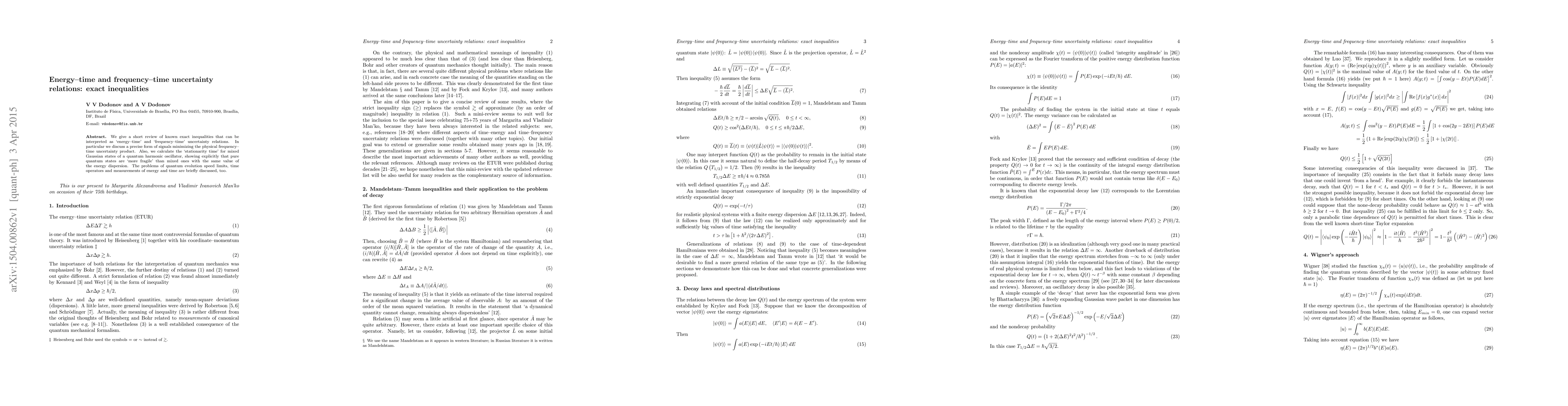 This paper reviews exact inequalities known as energy-time and frequency-time uncertainty relations, focusing on signals that minimize the physical frequency-time uncertainty product. It also examines the "stationarity time" for mixed Gaussian states in a quantum harmonic oscillator, demonstrating that pure states are more fragile than mixed states with the same energy dispersion.