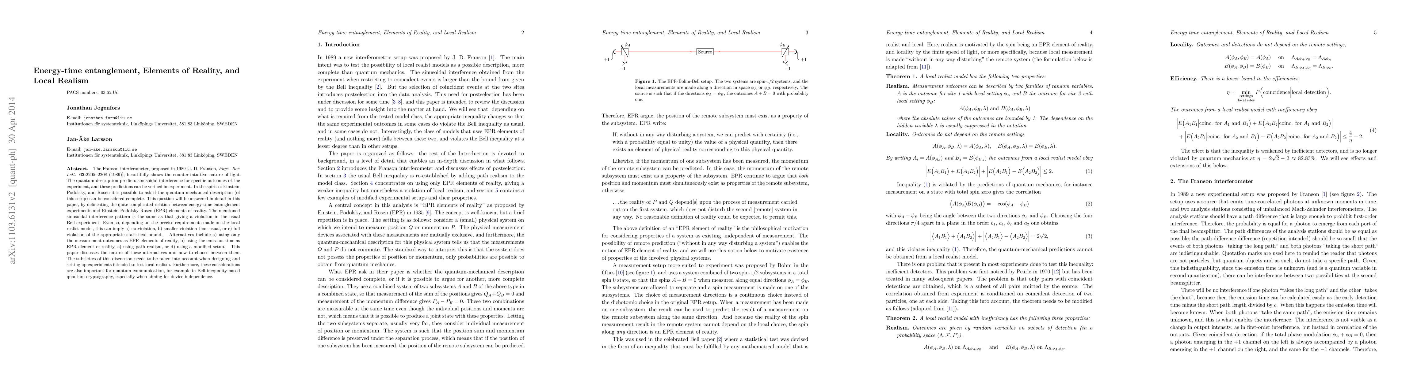 This paper explores the Franson interferometer's quantum predictions and their implications for local realism and completeness of quantum mechanics, analyzing the nuanced relationship between energy-time entanglement and EPR elements of reality. It discusses various alternatives for defining these elements and their impact on Bell test violations, crucial for quantum communication and cryptography.
