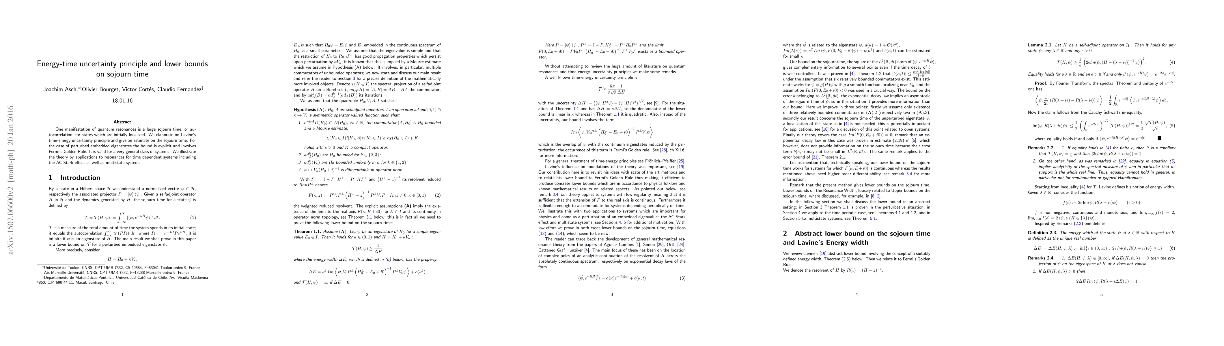 One manifestation of quantum resonances is a large sojourn time, or autocorrelation, for states which are initially localized. We elaborate on Lavine's time-energy uncertainty principle and give an estimate on the sojourn time. For the case of perturbed embedded eigenstates the bound is explicit and involves Fermi's Golden Rule. It is valid for a very general class of systems. We illustrate the theory by applications to resonances for time dependent systems including the AC Stark effect as well as multistate systems.