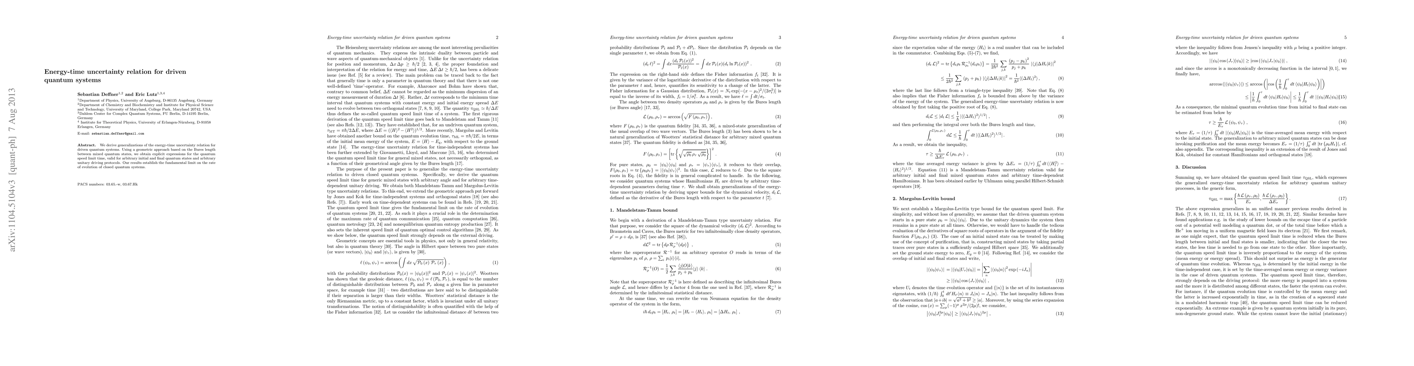 This paper generalizes the energy-time uncertainty relation for driven quantum systems, deriving explicit expressions for the quantum speed limit time using a geometric approach based on the Bures length. The findings establish fundamental limits on the rate of evolution for various quantum states and driving protocols.