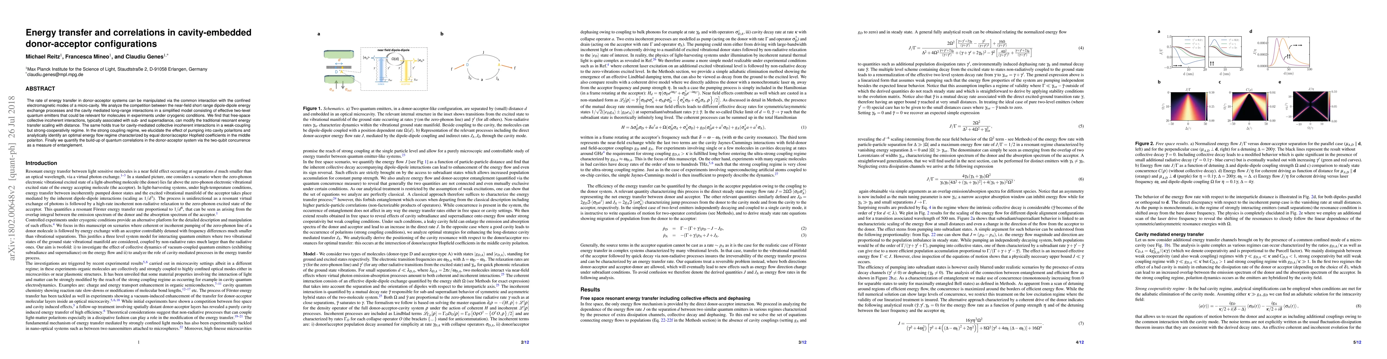 This paper investigates how energy transfer rates in donor-acceptor systems can be influenced by interactions with micro-cavity electromagnetic modes, revealing that both near-field and cavity-mediated interactions can alter traditional energy transfer scaling. It also identifies an optimal energy flow regime in strong coupling and quantifies the build-up of quantum correlations through two-qubit concurrence.