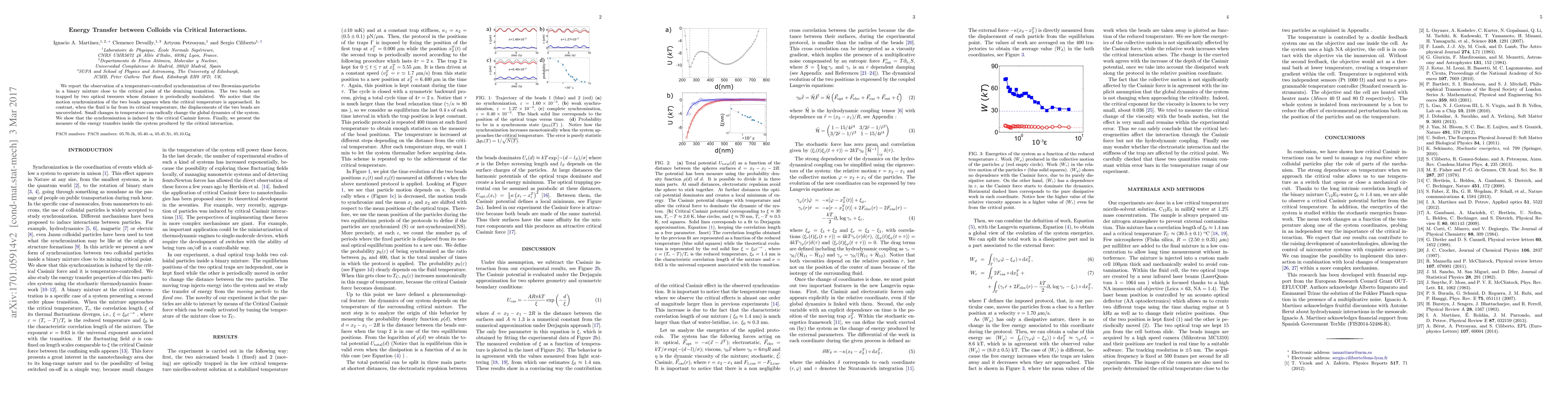 Researchers observe synchronization of two particles in a binary mixture near its critical temperature, attributing it to critical Casimir forces, which cause energy transfers between the system.
