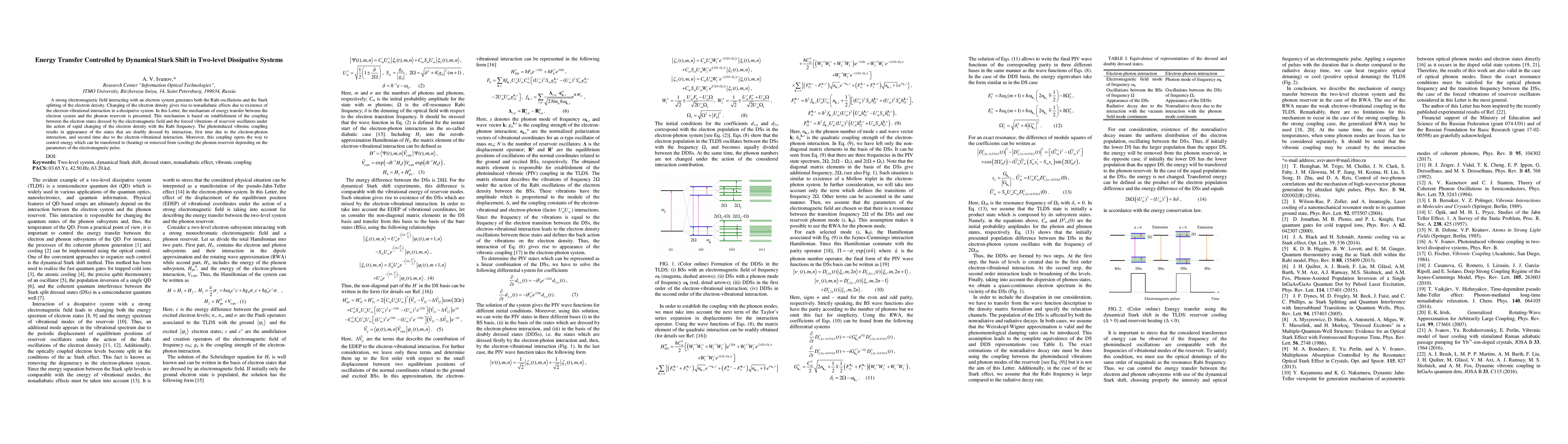 A strong electromagnetic field interacting with an electron system generates both the Rabi oscillations and the Stark splitting of the electron density. Changing of the electron density gives rise to nonadiabatic effects due to existence of the electron-vibrational interaction in a dissipative system. In this Letter, the mechanism of energy transfer between the electron system and the phonon reservoir is presented. This mechanism is based on establishment of the coupling between the electron states dressed by the electromagnetic field and the forced vibrations of reservoir oscillators under the action of rapid changing of the electron density with the Rabi frequency. The photoinduced vibronic coupling results in appearance of the states that are doubly dressed by interaction, first time due to the electron-photon interaction, and second time due to the electron-vibrational interaction. Moreover, this coupling opens the way to control energy which can be transferred to (heating) or removed from (cooling) the phonon reservoir depending on the parameters of the electromagnetic pulse.