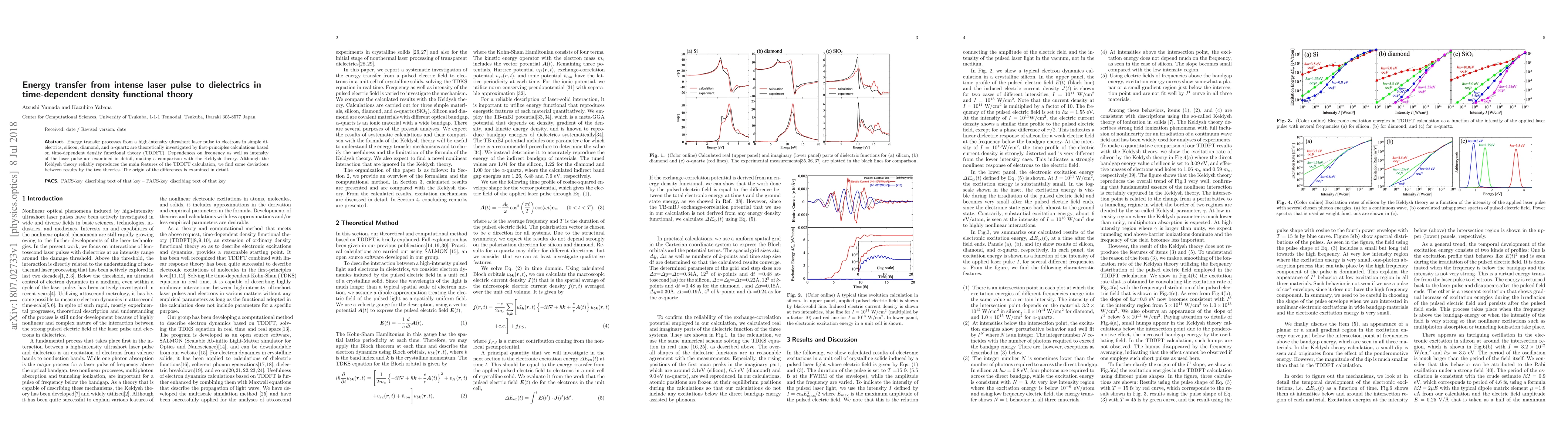 This paper investigates the energy transfer from high-intensity ultrashort laser pulses to electrons in dielectrics like silicon, diamond, and $\alpha$-quartz using time-dependent density functional theory (TDDFT). It compares TDDFT results with Keldysh theory, finding some discrepancies and analyzing their origins.
