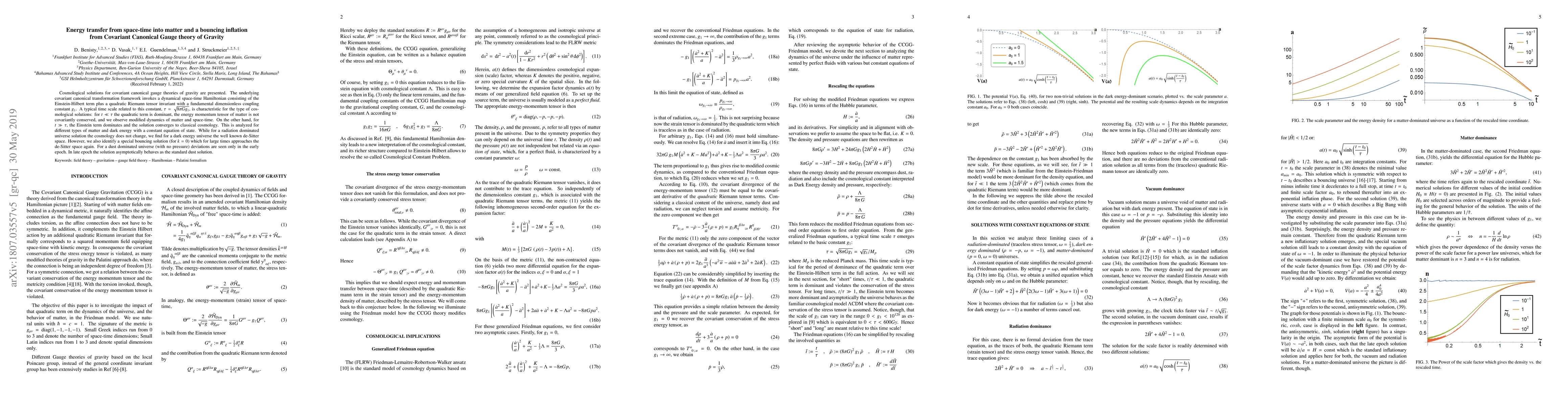 Cosmological solutions for covariant canonical gauge theories of gravity are presented. The underlying covariant canonical transformation framework invokes a dynamical space-time Hamiltonian consisting of the Einstein-Hilbert term plus a quadratic Riemann tensor invariant with a fundamental dimensionless coupling constant $g_1$. A typical time scale related to this constant, $\tau = \sqrt{8 \pi G g_1}$, is characteristic for the type of cosmological solutions: for $t \ll \tau$ the quadratic term is dominant, the energy-momentum tensor of the matter is not covariantly conserved, and we observe modified dynamics of matter and space-time. On the other hand, for $t \gg \tau$, the Einstein term dominates and the solution converges to classical cosmology. This is analyzed for different types of matter and dark energy with a constant equation of state. While for a radiation dominated universe solution the cosmology does not change, we find for a dark energy universe the well known de-Sitter space. However, we also identify a special bouncing solution (for $k=0$) which for large times approaches the de-Sitter space again. For a dust dominated universe (with no pressure) deviations are seen only in the early epoch. In the late epoch, the solution asymptotically behaves like the standard dust solution.
