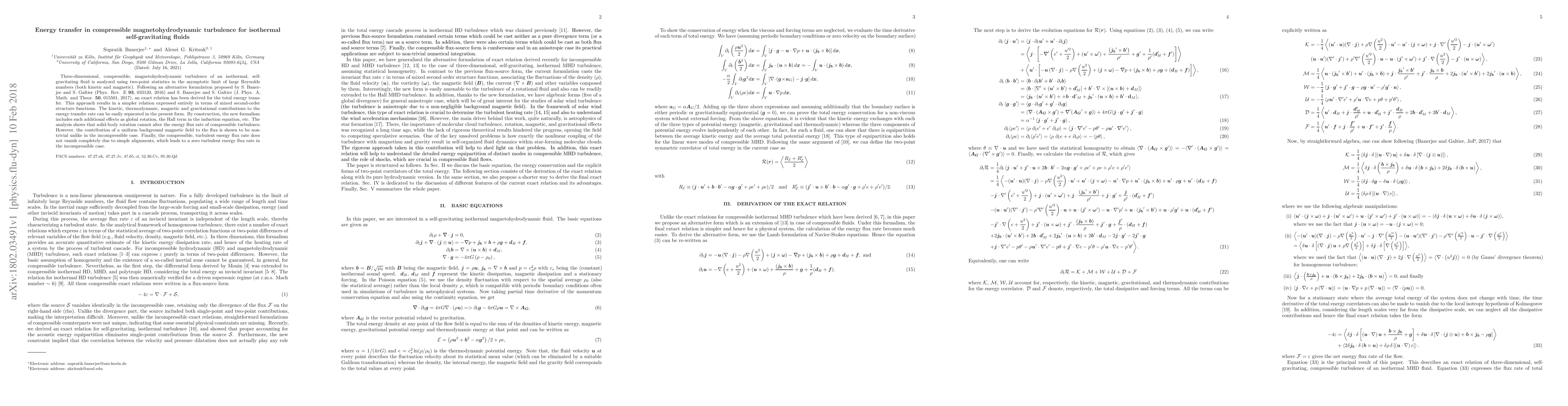 This paper analyzes the energy transfer in compressible magnetohydrodynamic turbulence of isothermal, self-gravitating fluids, deriving an exact relation for total energy transfer expressed in terms of mixed second-order structure functions. The study shows that solid-body rotation does not affect the energy flux rate, while a uniform magnetic field does, unlike the incompressible case.