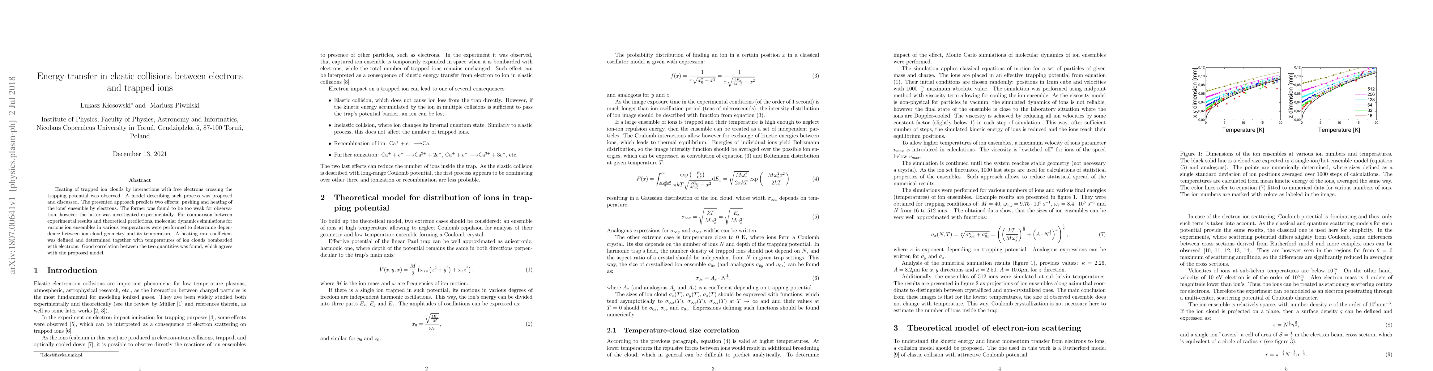 This paper investigates energy transfer in elastic collisions between free electrons and trapped ions, proposing a model that predicts both pushing and heating effects on the ion ensemble. Experimental results show good correlation with theoretical predictions, confirming the heating effect and validating the proposed model.