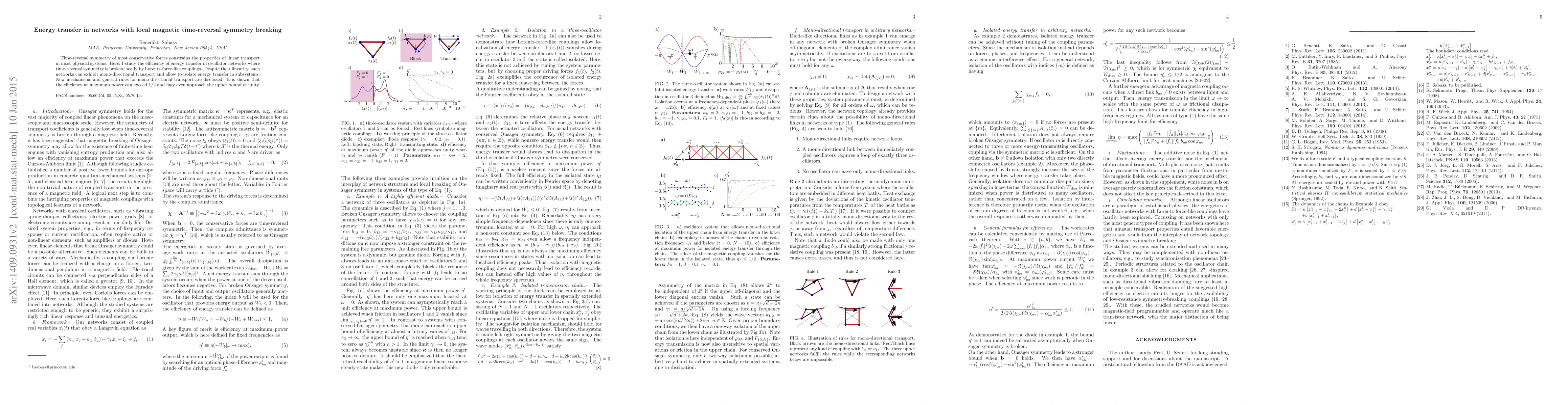 Time-reversal symmetry of most conservative forces constrains the properties of linear transport in most physical systems. Here, I study the efficiency of energy transfer in oscillator networks where time-reversal symmetry is broken locally by Lorentz-force-like couplings. Despite their linearity, such networks can exhibit mono-directional transport and allow to isolate energy transfer in subsystems. New mechanisms and general rules for mono-directional transport are discussed. It is shown that the efficiency at maximum power can exceed $1/2$ and may even approach the upper bound of unity.