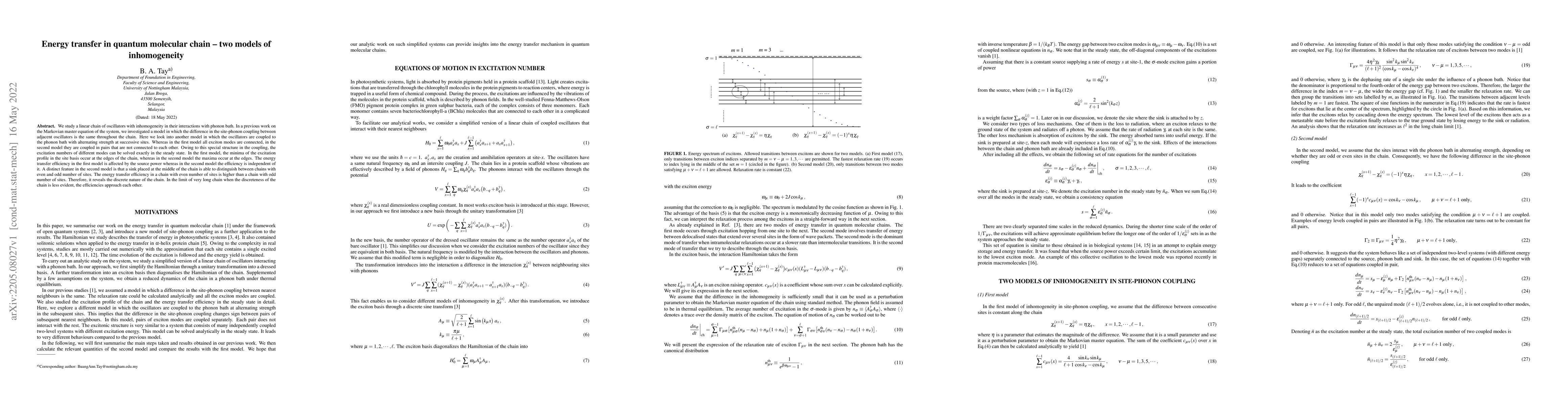 We study a linear chain of oscillators with inhomogeneity in their interactions with phonon bath. In a previous work on the Markovian master equation of the system, we investigated a model in which the difference in the site-phonon coupling between adjacent oscillators is the same throughout the chain. Here we look into another model in which the oscillators are coupled to the phonon bath with alternating strength at successive sites. Whereas in the first model all exciton modes are connected, in the second model they are coupled in pairs that are not connected to each other. Owing to this special structure in the coupling, the excitation numbers of different modes can be solved exactly in the steady state. In the first model, the minima of the excitation profile in the site basis occur at the edges of the chain, whereas in the second model the maxima occur at the edges. The energy transfer efficiency in the first model is affected by the source power whereas in the second model the efficiency is independent of it. A distinct feature in the second model is that a sink placed at the middle of the chain is able to distinguish between chains with even and odd number of sites. The energy transfer efficiency in a chain with even number of sites is higher than a chain with odd number of sites. Therefore, it reveals the discrete nature of the chain. In the limit of very long chain when the discreteness of the chain is less evident, the efficiencies approach each other.